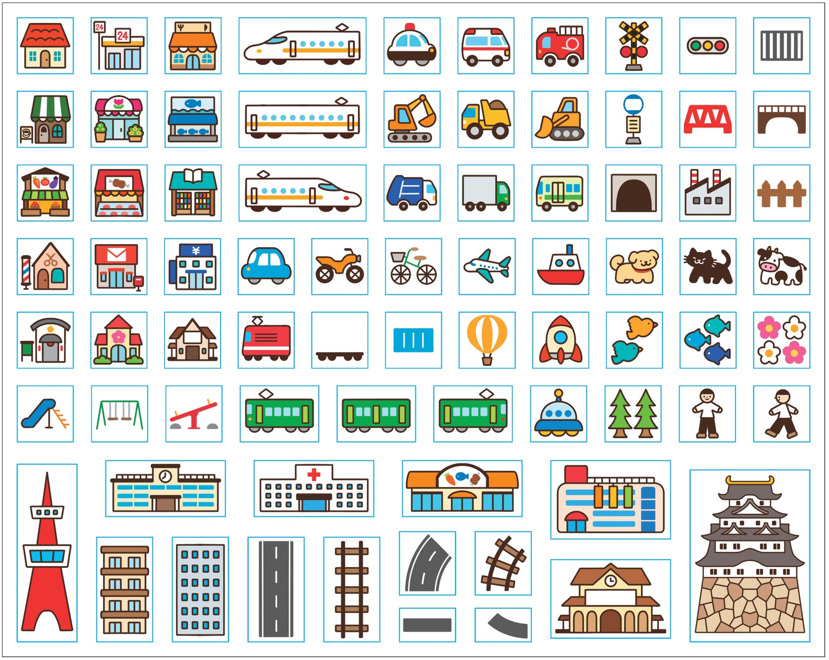 付属のはんこパーツには、乗り物や建物、線路や道路、信号やポストなど、まちで見かけるいろんなアイテムの絵柄が全部で77種類。最初に「絵柄シール」を各はんこパーツに貼り付けて、はんこを完成させましょう。(※スタンプ台は付属しておりませんので、別途ご用意ください)