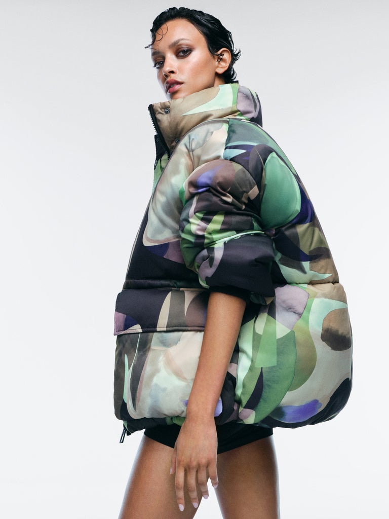 グリーン、グレー、パープルを基調とした水彩ボタニカル迷彩ジャケット。快適でスタイリッシュ。