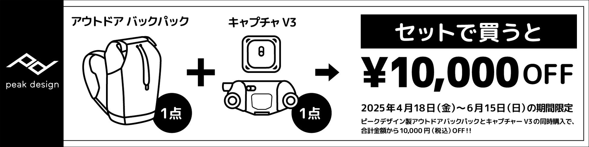 2025年4月18日(金)〜6月15日(日)の期間内に対象のピークデザイン製「アウトドアバックパック」と「キャプチャーV3」をセットでご購入いただくと、合計金額から10,000円(税込)をお値引きする、お得なキャンペーンを実施いたします。