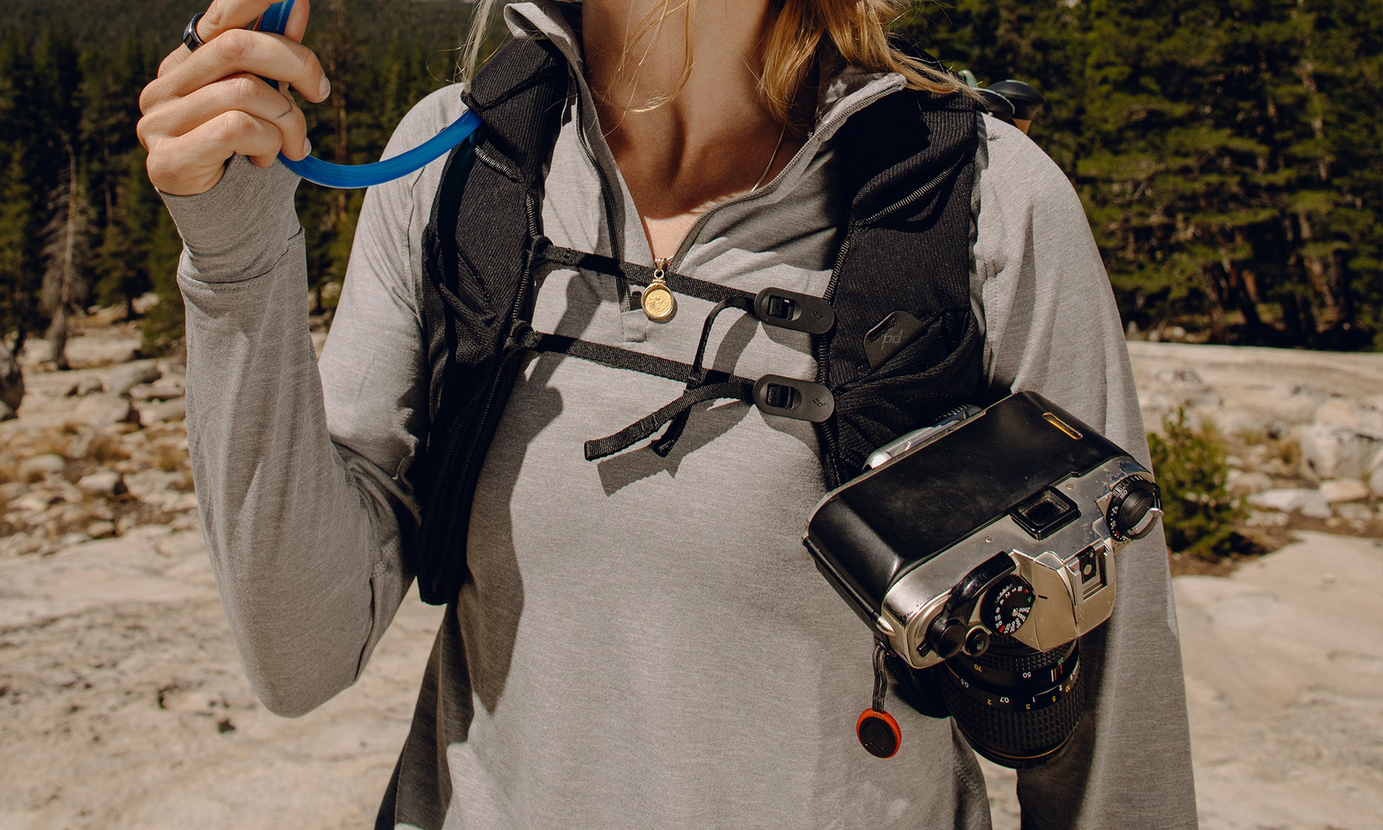 ランニングベストから着想を得た幅広くフラットな形状のショルダーストラップが、体のより広い範囲に荷重を分散して腕や肩の負担を軽減。ストラップには、スマートフォンやサングラスなどを収納できる小さなメッシュポケットと、ピークデザイン製キャプチャーカメラクリップを取り付けるスリットが付いています。