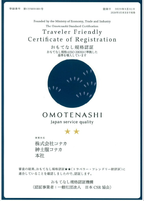 【コナカ・フタタ】改正された「おもてなし規格認証」制度において『★★紺認証』を再取得