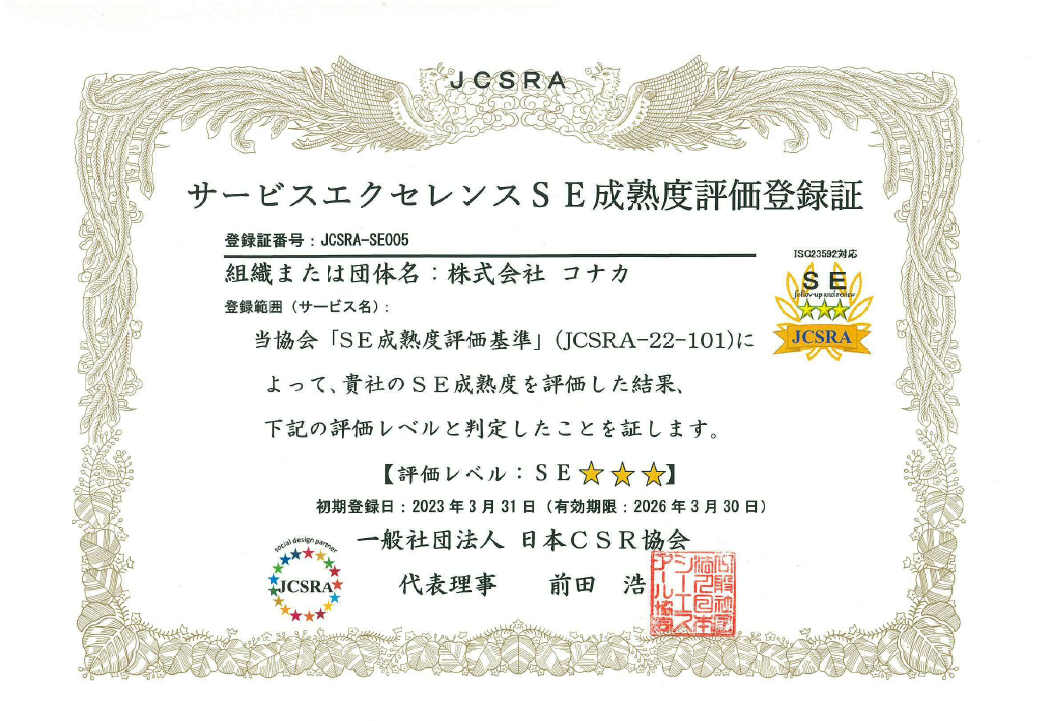 「サービスエクセレンスSE成熟度評価」は、「おもてなし規格認証」の認証機関(経済産業省採択)である一般社団法人 日本CSR協会が、ISO23592のサービスエクセレンスに準拠した卓越された顧客経験とカスタマデライトをもたらす驚きのある優れたサービスの提供(エクセレントサービス)に対する評価登録を行うものです。