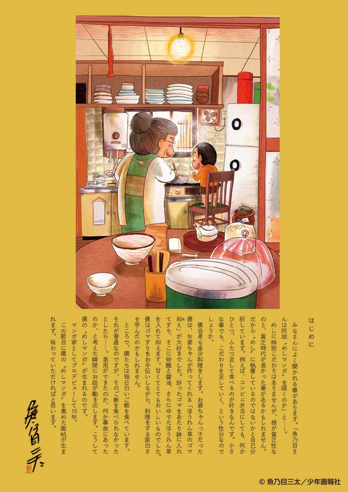 「きのうの食卓」と題した章では、『戦争めし』より「戦艦大和のラムネ」、「零戦の空弁」などを紹介。旧日本陸軍・海軍の食糧事情、そして寿司や鰻のタレなど戦火に負けず守り継がれた日本の食文化を解説する。「きょうの食卓」の章では、町中華に立ち食い蕎麦、おでんの屋台など、みんなが大好き庶民派グルメが登場! 「あしたの食卓」の章では、“家族のあり方”を食卓の上に探す魚乃目作品に迫る。