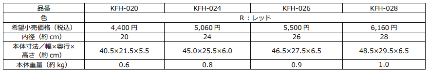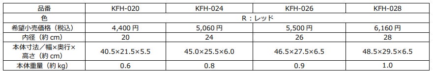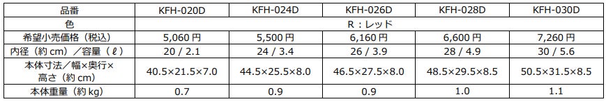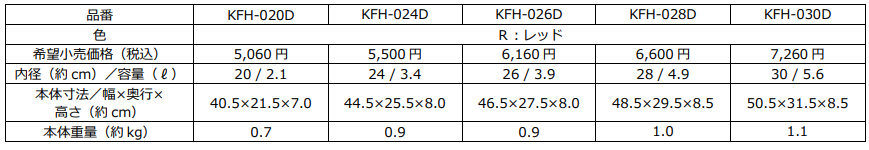 『サーモス デュラブルシリーズ 炒め鍋KFH (KFH-020D/024D/026D/028D/030D)』仕様一覧
