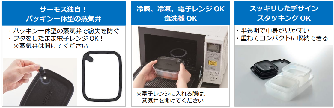 角型の『KC-SAシリーズ』は、蒸気弁の紛失を防ぐサーモス独自の一体構造のパッキンを採用し、フタをしたまま電子レンジ(※)でご使用いただけます。※電子レンジ使用時は蒸気弁を開けてください。