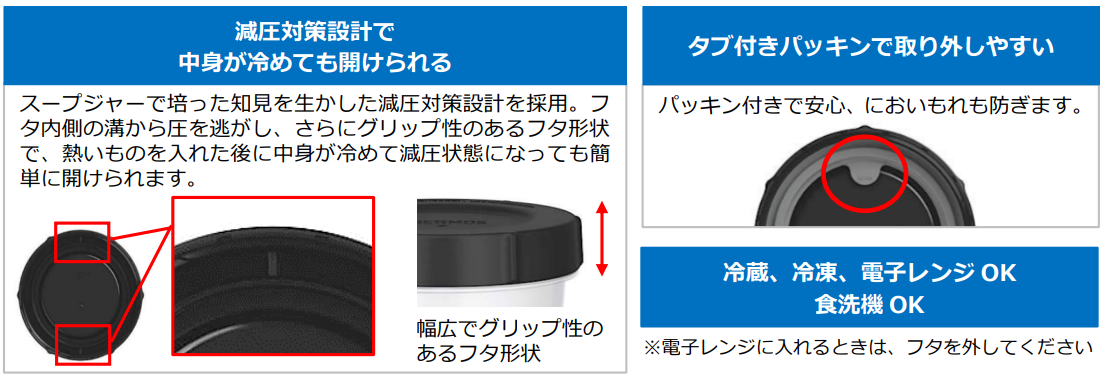 丸型の『KC-RAシリーズ』は、『真空断熱スープジャー』での知見を生かした減圧対策設計を採用。熱いものを入れた後に中身が冷めて減圧状態になってもフタが簡単に開けられる仕様です。タブ付きで着脱しやすい