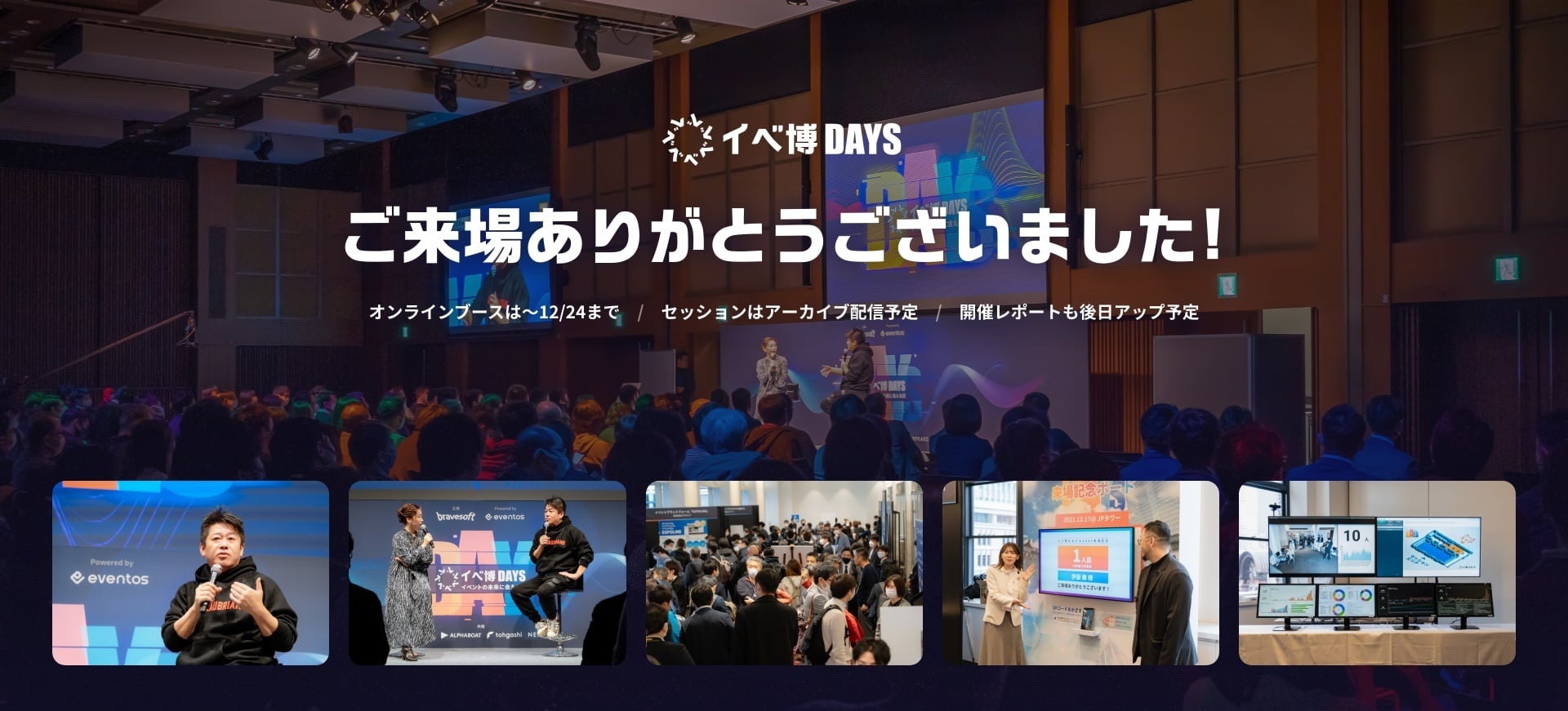 上記でも紹介したイベ博DAYSのWEB/アプリで実施している「イベ博DAYS」アンケートをお答えいただいた方を対象に、今回のイベ博DAYSの詳細イベントレポートをお送りさせていただきます(1月中旬予定)