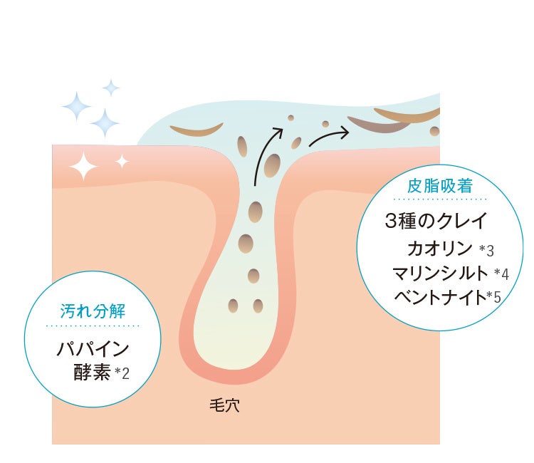 汗・⽪脂、古い⾓質が混じり、詰まった⽑⽳汚れ。パパイン酵素*2が⽑⽳奥深くの汚れ(⿊ずみ)まで分解し、特徴が異なる3種の微粒⼦クレイで余分な⽪脂をしっかりオフします。 クレイの中でも収れん⼒に優れた「カオリン*3」を採⽤。パック後はきゅっと引き締まった、思わず触れたくなるような⽑⽳レス*1印象の涼やかな肌をかなえます。