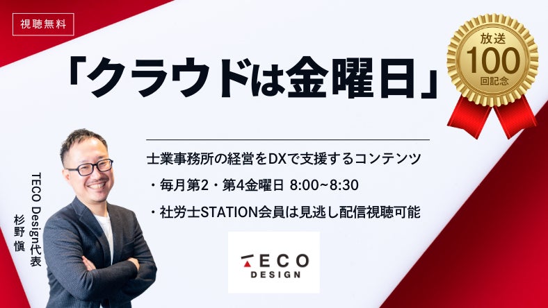 人事労務分野のシステム活用・導入支援を手掛ける株式会社TECO Design(本社:東京都新宿区、代表取締役社長 : 杉野 愼)は、運営する社労士検索サイト「社労士STATION」にて放送しているウェビナーシリーズ「クラウドは金曜日」の放送がこの度100回を迎えることをお知らせいたします。
