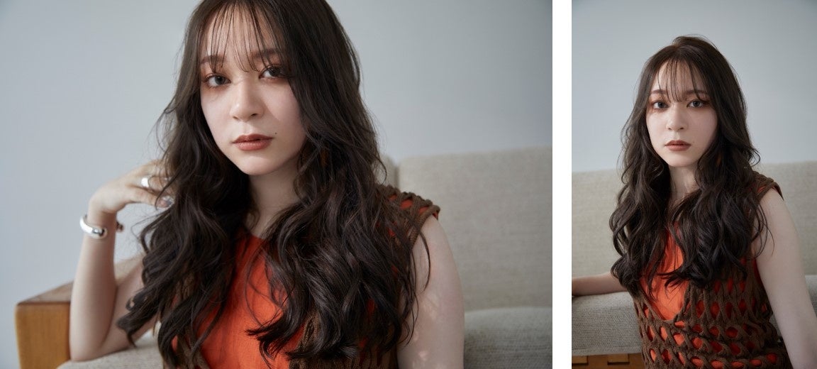 全体のシルエットは重さを残し、顔まわりのレイヤーでくびれを与えるのがポイント。波巻きにしなくても、レイヤーごとのワンカ ールで韓国風スタイルに仕上がります。また、顔まわりが姫カットになっているのもポイント。ストレートを生かしたスタイリング にすると、K-POPアイドル風の強めロングも楽しめます。前髪をかきあげ、大人っぽいスタイルにしても新鮮でおすすめです。