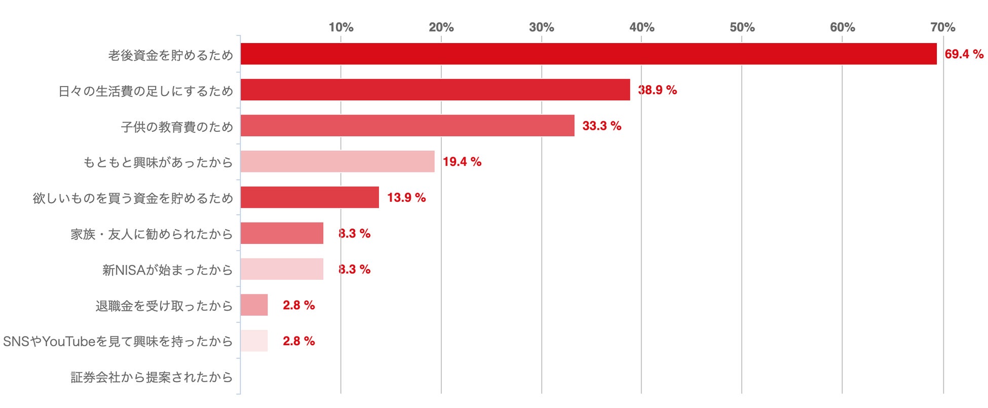 また、「証券会社から提案されたから」を理由に挙げた回答者が1人もいないことから、公務員は明確な目標を持って資産運用に臨んでいると推測できる。