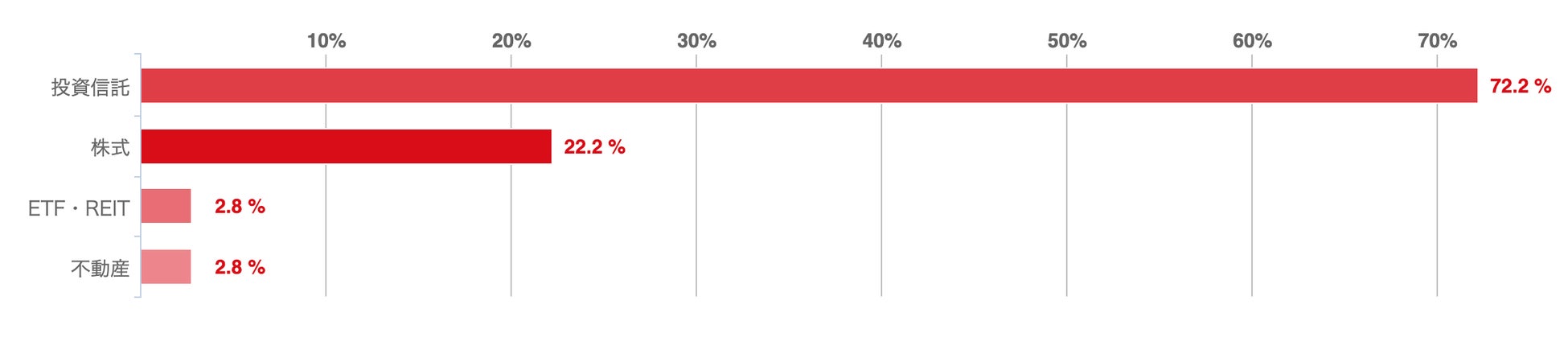 アンケートによれば、公務員におすすめの運用先としては「投資信託(72.2%)」が多くの支持を獲得する結果となった。2位の「株式(22.2%)」と比較しても、3倍以上の人気を得ており、圧倒的な信頼度の高さを誇っているといえる。
