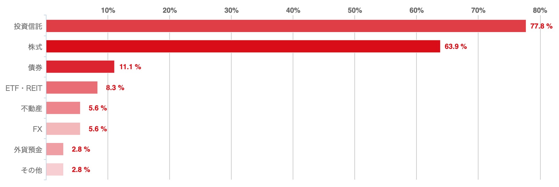 回答者のうち77.8%が「投資信託」をポートフォリオに組み込んでいる。これは「ほったらかし投資が可能なこと」や「リスクとリターンのバランスが取れること」が評価されているためである。