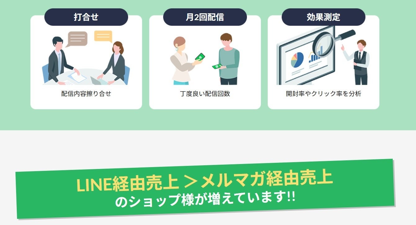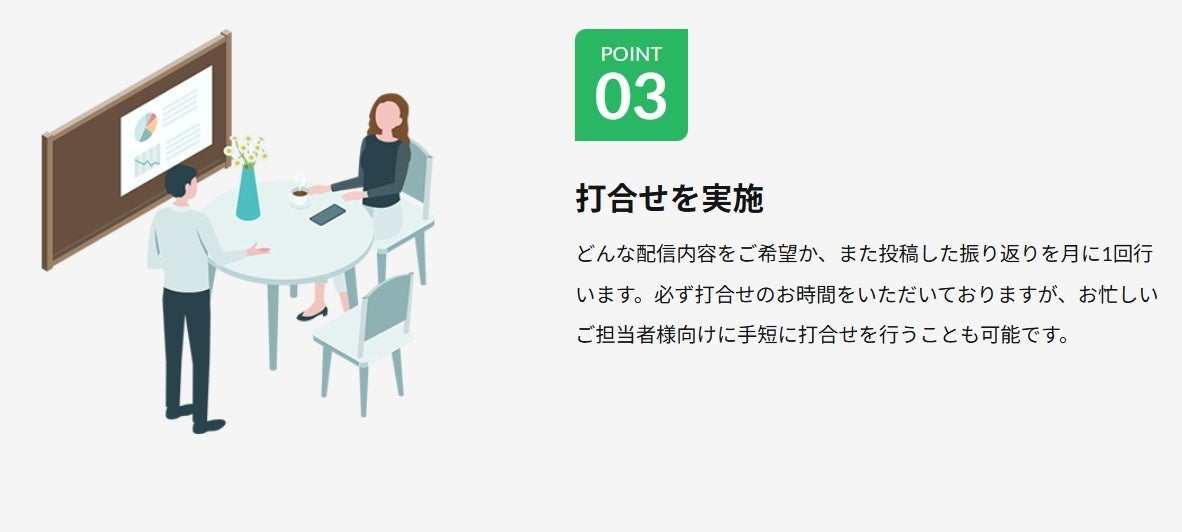 コスパ重視のライン配信代行サービスです。月1回のお打合せで内容修正や結果振り返りを行います。