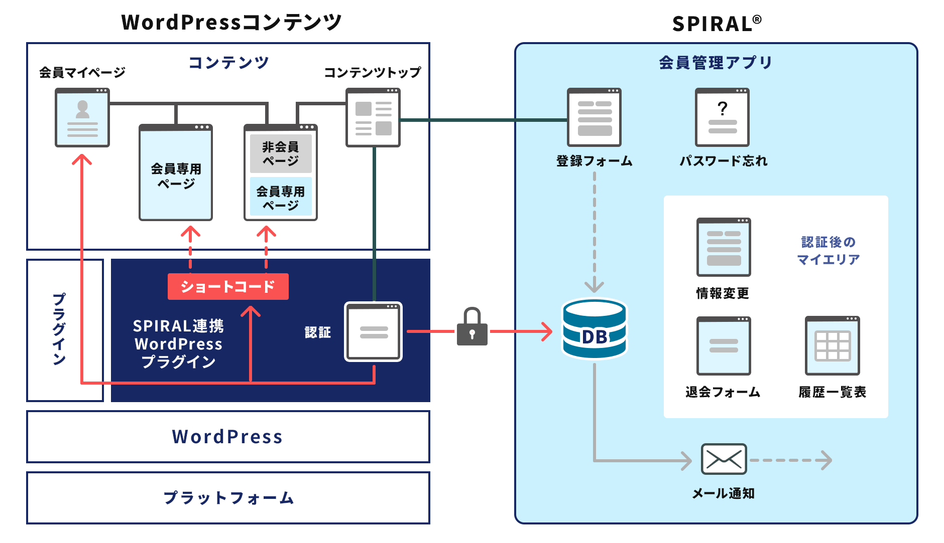 本サービスは、WordPressで作成されたWebサイトと「SPIRAL ver.1」のデータベースを連携し、セキュアな会員サイトが安全に短期間で制作できるWordPressプラグインです。「SPIRAL ver.1」をサイト利用者のログイン認証基盤としたセッション管理および認証機能の高速処理が可能となります。また、会員サイトにログインした際、会員向けの情報や資料が見られるようになるだけでなく、会員種別やデータ条件によって表示させるWebコンテンツ内容を制御し、1つのページで、会員一人ひとりに適したコンテンツを表示させることができ、顧客体験の向上も見込めます。出し分けしたい内容をショートコードで挟むだけなので、プログラミング知識がない方でも簡単にコンテンツの作成や更新ができます。
