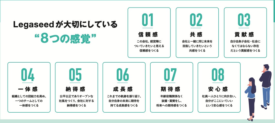 このようにイベント企画運営にこだわりを持つ当社では、企業様のイベントプロデュースも一貫して承っています。ただ実施することを目的とするのではなく、組織力を向上させる機会とするため、「信頼感」「共感」「貢献感」「一体感」「納得感」「成長感」「期待感」「安心感」の8つの感覚を大切にしています。