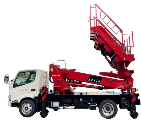 今回の「トンネル点検プラットフォーム」は、トンネル点検作業の効率化と作業員の作業負担軽減を目的に開発された高所作業車です。最大の特徴は、プラットフォームの作業台をトンネルのアーチに沿うよう階段状に変形する仕様にしたことで、点検の際に一度に広範囲の点検作業を行うことを可能にしました。