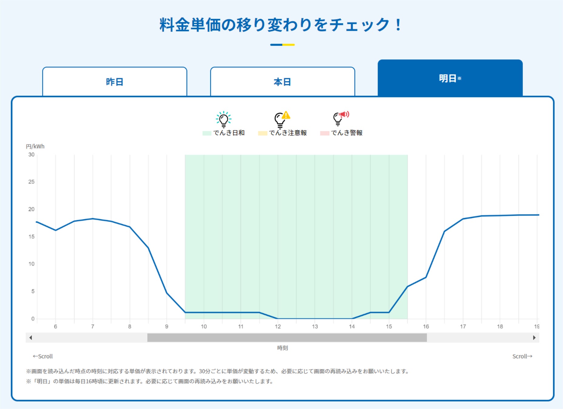 Looopでんきウェブサイトの「でんき予報 https://looop-denki.com/home/denkiforecast/」やアプリで、30分毎の電源料金単価を確認することが出来ます。]