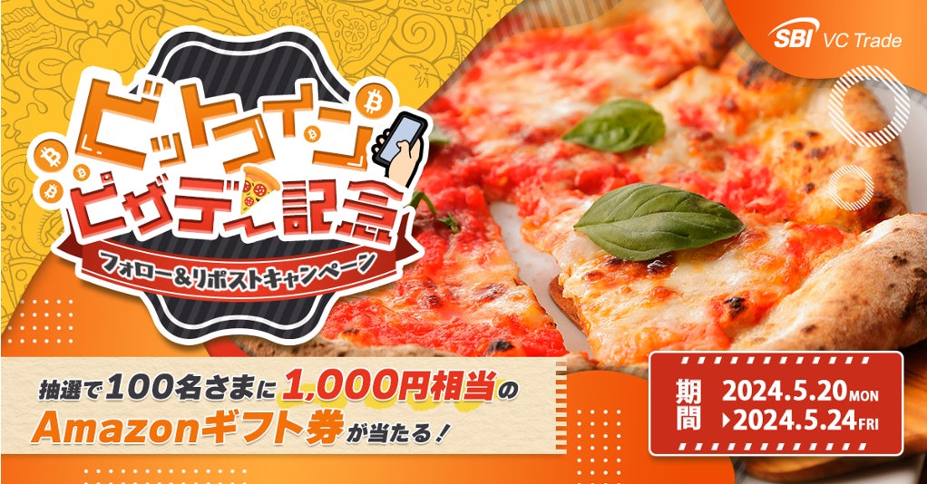 SBI VCトレード株式会社(本社:東京都港区、代表取締役社長:近藤 智彦、以下「当社」)は、2024年5月20日(月)より、「ビットコインピザデー記念!フォロー&リポストキャンペーン~抽選で100名さまに1,000円相当のAmazonギフト券が当たる!~」を実施することをお知らせいたします。