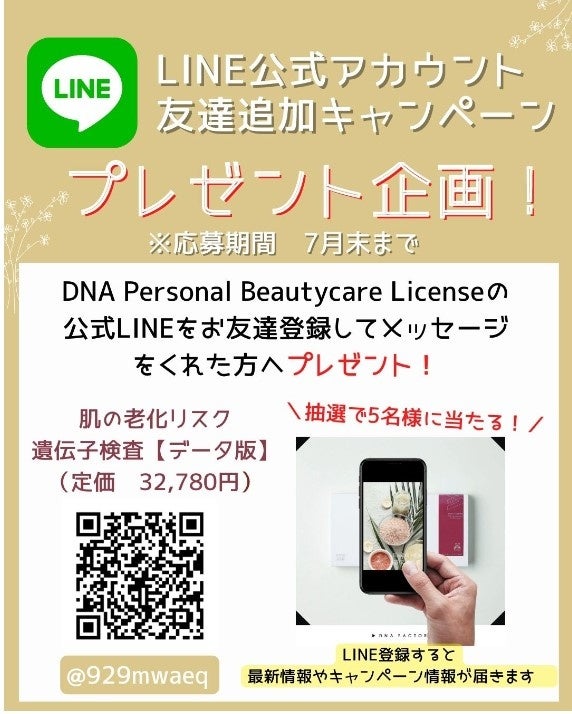 株式会社アルプロンのグループ会社、DTCフィールドで子ども向けの能力遺伝子検査数最大シェア数を誇る株式会社DNA FACTOR(福岡県福岡市:代表取締役 多根和宏)は、美容関連遺伝子に関する知識習得を目的にした資格制度【DNA Personal Beauty care Lisence(DNAパーソナルビューティケアライセンス)】の公式LINEを開設し、LINE公式アカウントの友達追加キャンペーンを開催致します。