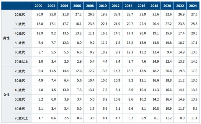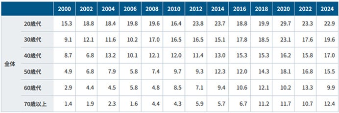 性別にみると、総じて女性よりも男性のほうが高いものの2020年までは男女ともに上昇していた。特に女性は2000年の4.4%と比べて約3.5倍の16.2%まで増加した。2024年は男性の増加(前回比0.4ポイント増[18.9%→19.3%])に対して女性は減少(前回比0.5ポイント減[12.9%→12.4%])し、いずれも僅差ではあるものの男女で異なる傾向がみられた。2000年と2024年で比較すると全体で8.6ポイント増(7.3%→15.9%)となり、この四半世紀の間に性別を問わず広く浸透が進んだものとみられる。