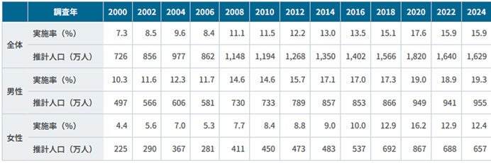 全体の年1回以上の実施率は15.9%であった。2000年(7.3%)から2020年(17.6%)までは20年間にわたって右肩上がりに上昇した。しかし2022年(15.9%)は減少に転じて2018年ごろの水準まで落ち込み、2024年も横ばいとなっている。