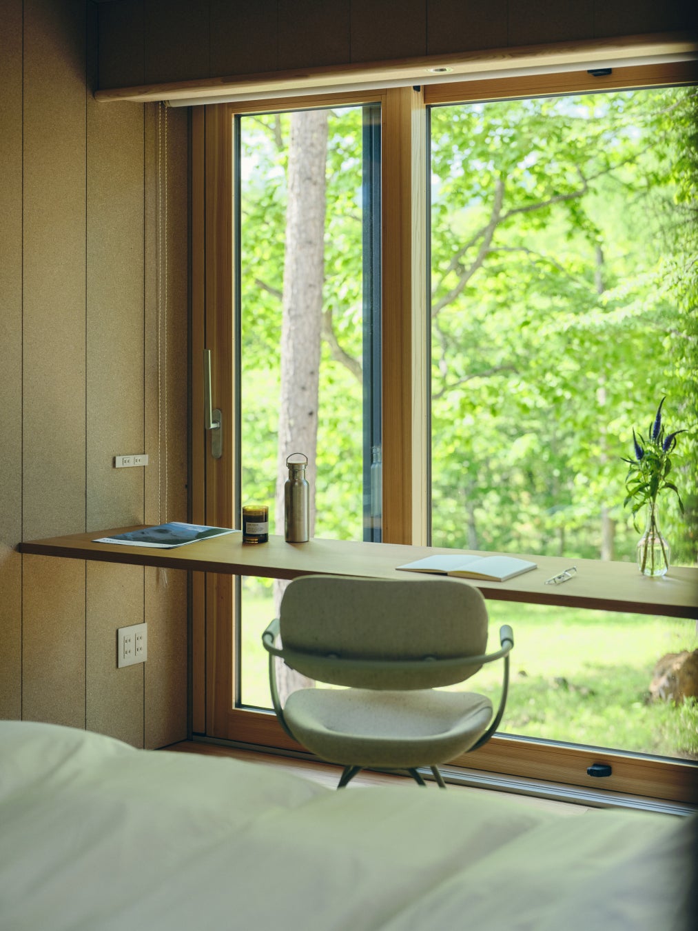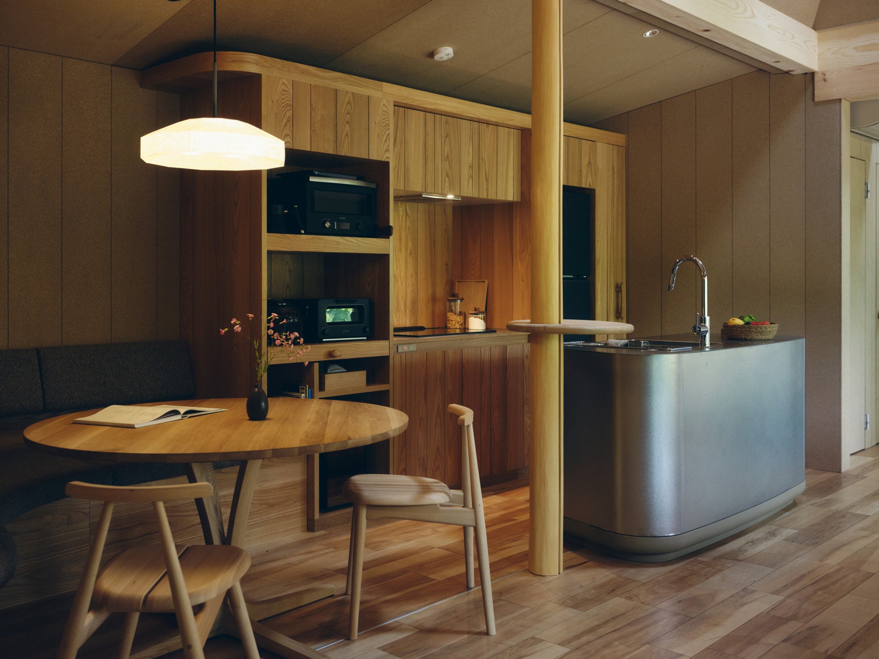 設計はADX 安齋好太郎氏が担当。自然とつながる暮らしをかたちにした全12棟のキャビンは、Mediumタイプ(屋内47.6㎡+バルコニー6.41㎡)と最大6名まで滞在できるLargeタイプ(全3棟)にはプライベートサウナも併設されています。