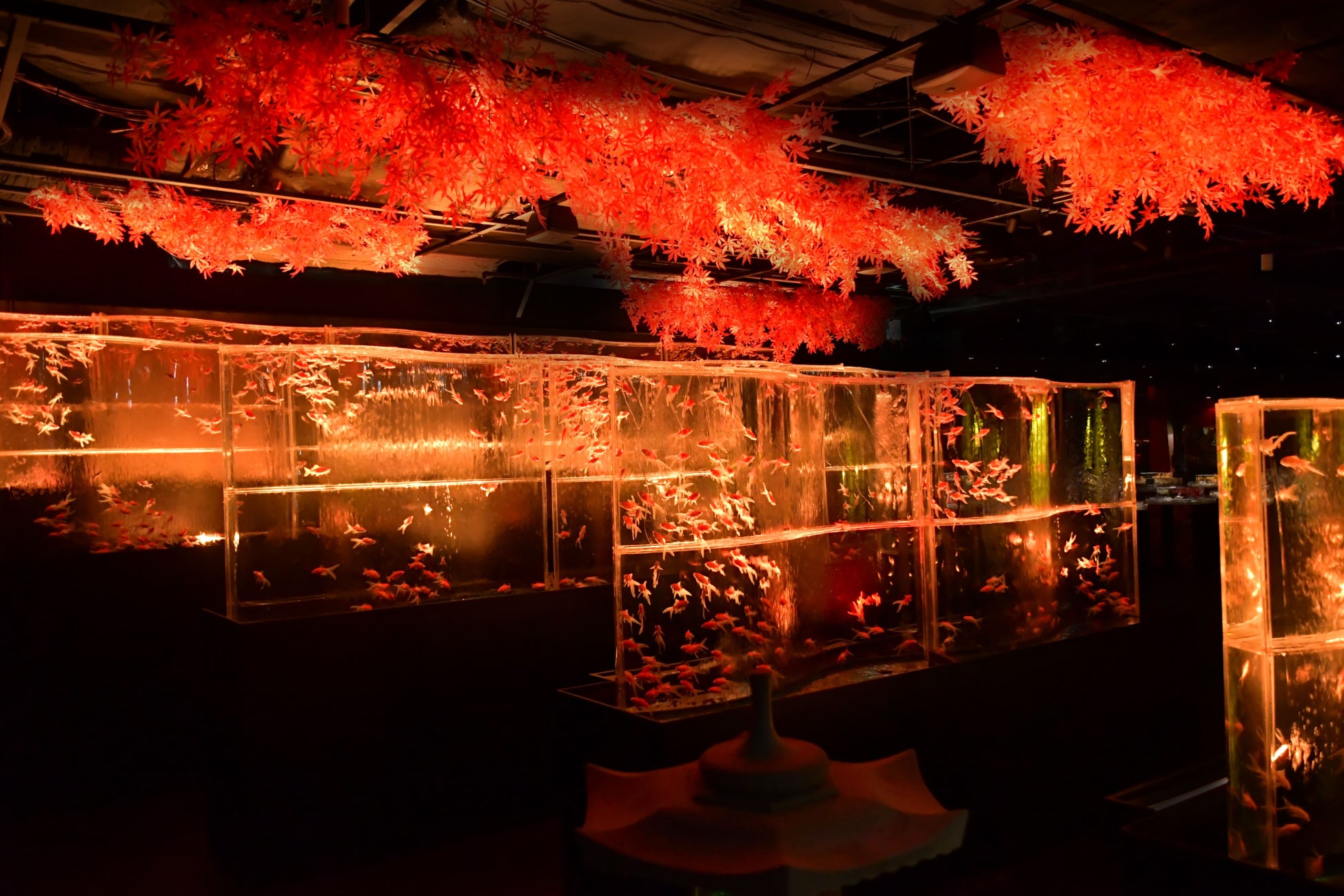日本の寺社建築に見られる回廊を表現した空間に立ち並ぶ金魚の列柱。ずっと続いているかのように見えるこの空間が紅黄葉(もみじ)カラーに染まり、秋らしい回廊になりました。