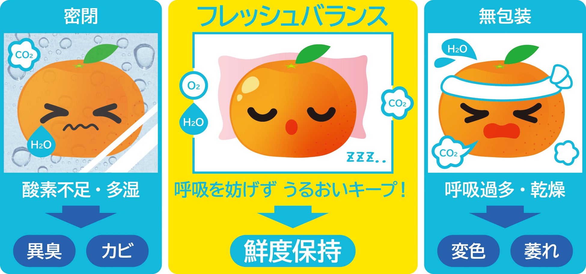 青果物は、収穫後も呼吸を続けるため、時間の経過とともに鮮度が低下します。この呼吸量と蒸散を適切にコントロールすることで、鮮度保持期間を延長することが可能です。