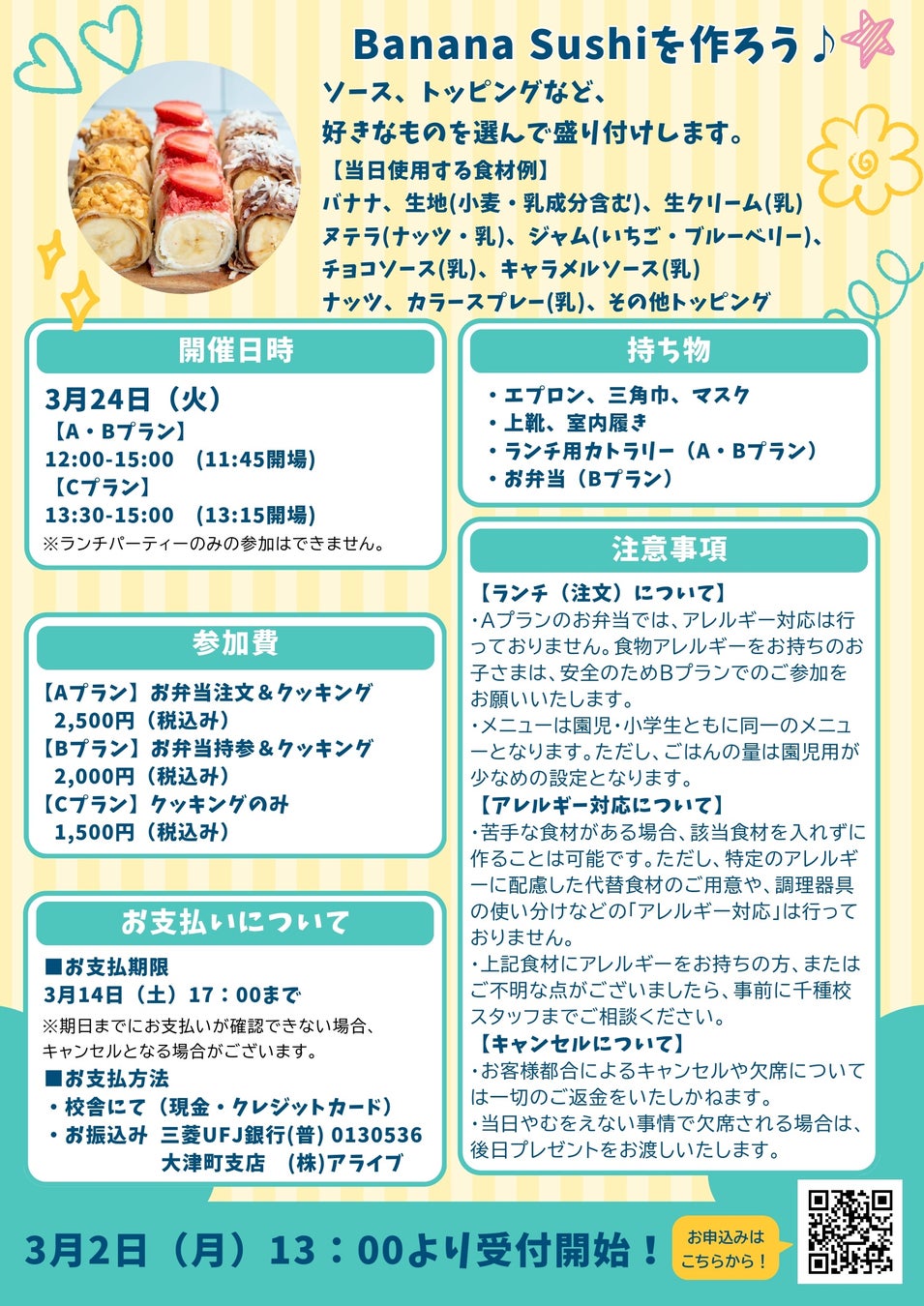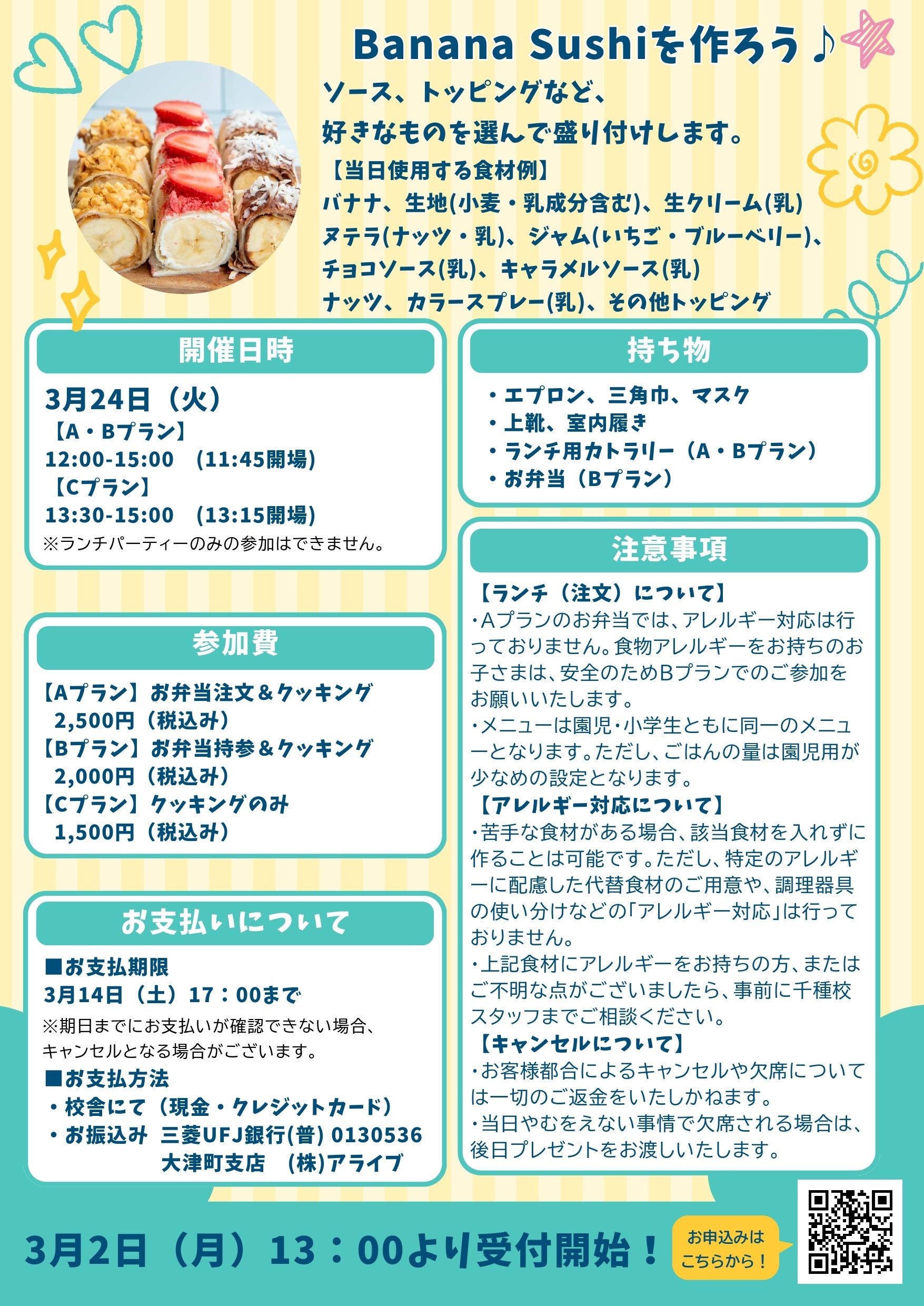 【名古屋・千種】英語でクッキング!園児・小学生向け「スプリングテーブルパーティー~Banana Sushiを作ろう~」イベント開催