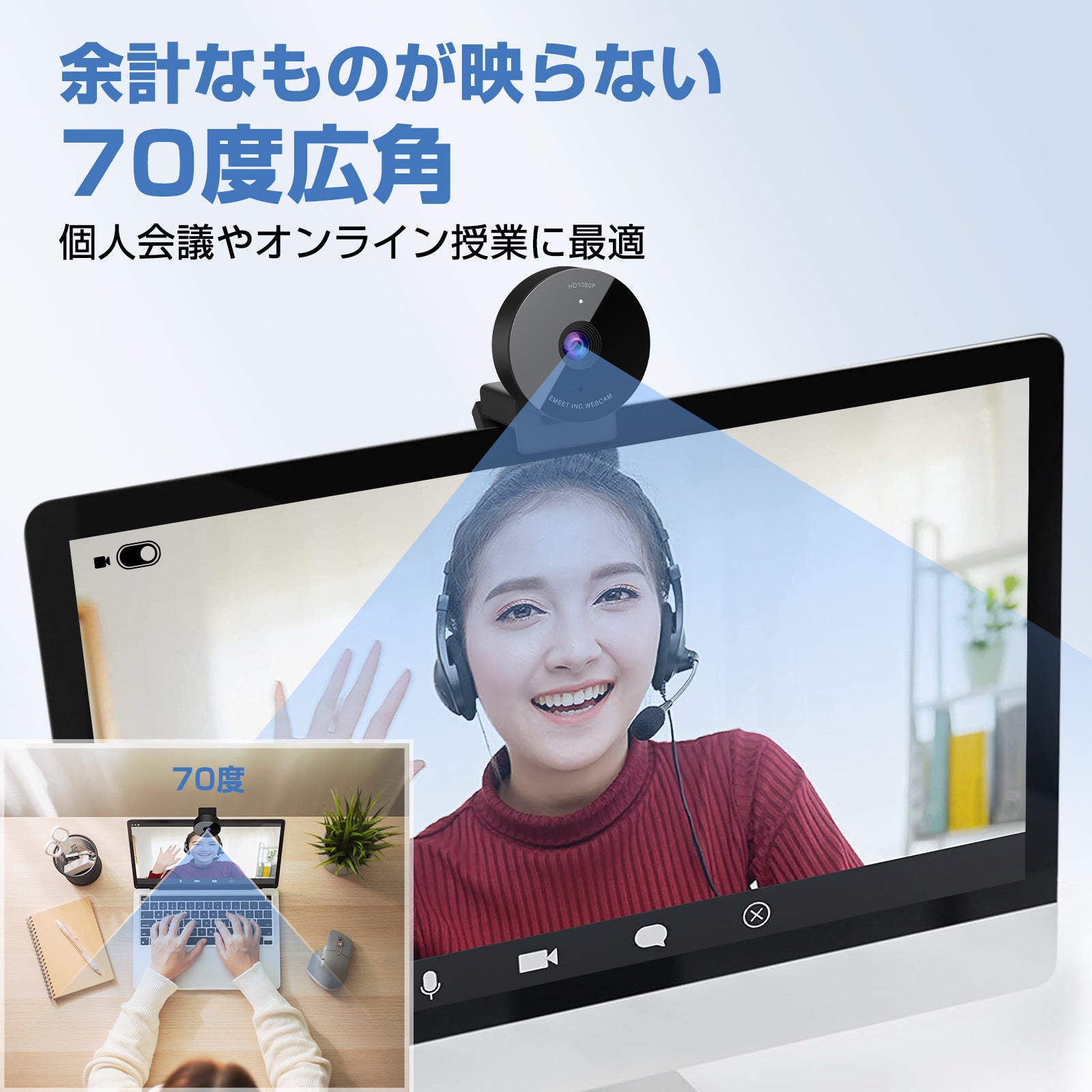 固定フォーカスレンズを搭載しており、ブレ等を解消してストレスのない映像記録が可能。70度の視野度により幅広い範囲をカバーできるため、個人会議やオンライン授業にも最適です。