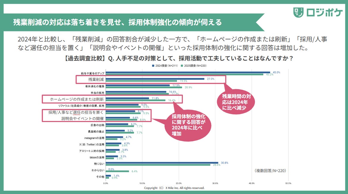2024年と比較し、「残業削減」の回答割合が減少した一方で、 「ホームページの作成・刷新」「採用/人事などの選任担当を置く」「説明会等の開催」が前回より増加し、採用体制を強化する企業が増加。