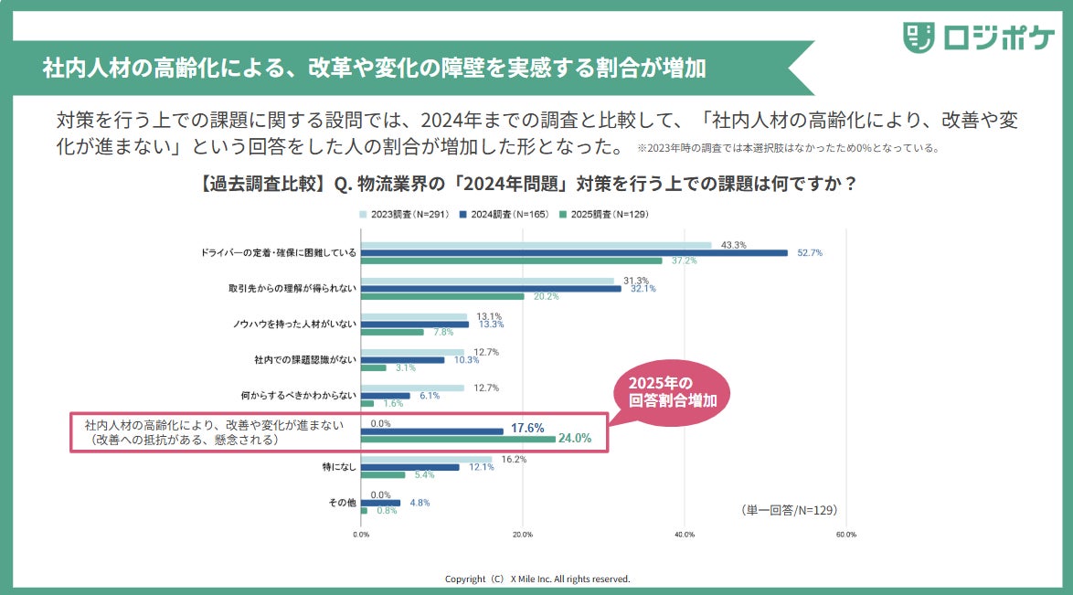 ドライバーの定着に関する課題が減少する一方で、「社内人材の高齢化により変化が進まない」が17.6%→24.0%に増加。