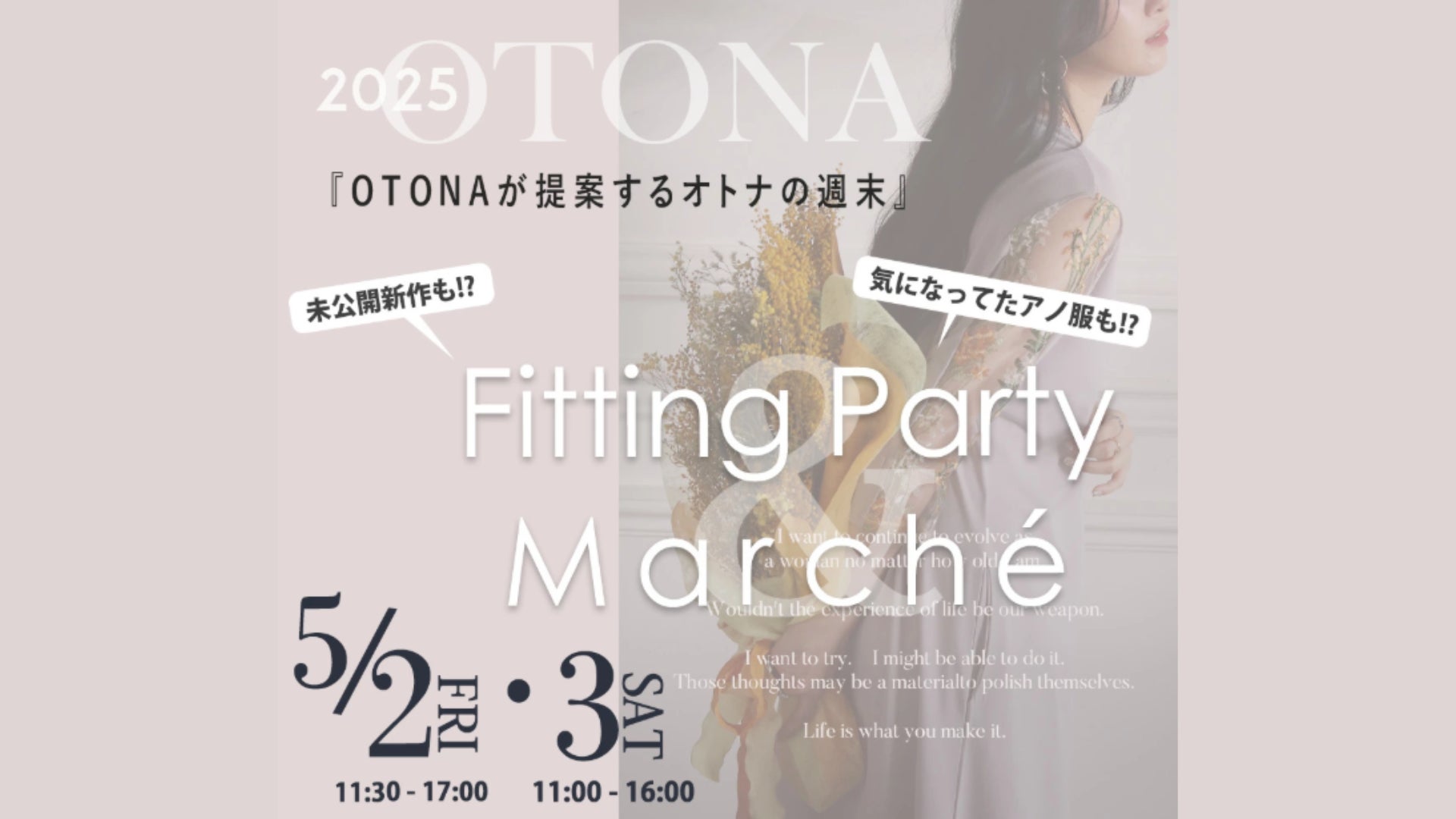 レディースアパレル通販を運営する株式会社ワンピース(本社:兵庫県加古川市 代表取締役:春木晃子)は、2025年5月2日(金)、5月3日(土)の2日間、ブランドOTONA(オトナ)による試着会&マルシェを株式会社ワンピースOTONA撮影スタジオ(兵庫県加古川市)にて開催します。