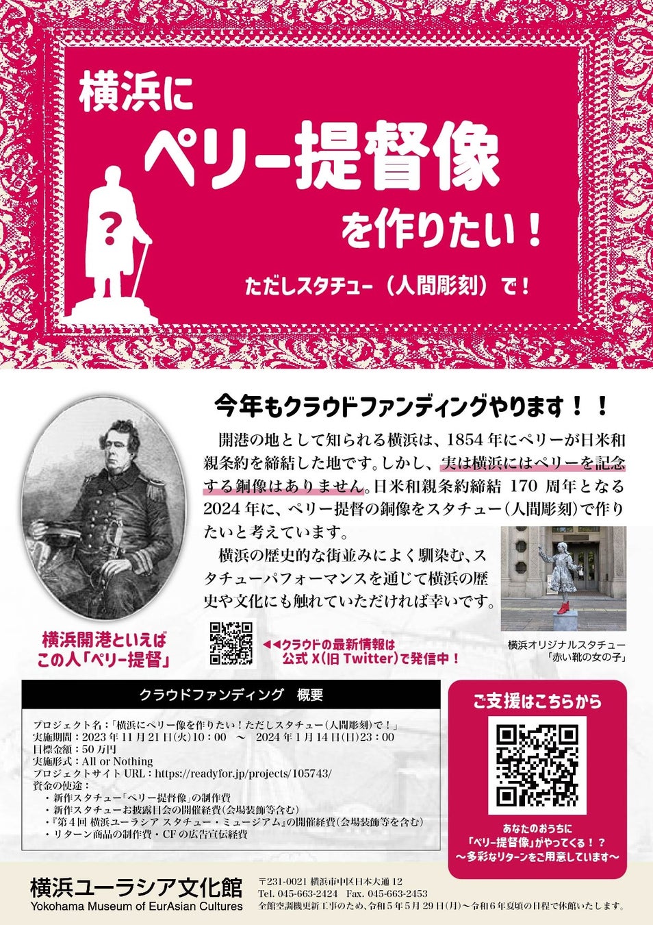 公益財団法人横浜市ふるさと歴史財団(代表理事:佐藤信)が管理運営する横浜ユーラシア文化館(横浜市中区、館長:西川武臣)が令和5年11月21日より実施してきたクラウドファンディング「横浜にペリー提督像を作りたい!ただしスタチュー(人間彫刻)で!」につきまして、支援の当初目標50万円に到達しました。引き続き、イベントの充実を図るため、ネクストゴールの80万円に向けたご支援をよろしくお願いいたします。