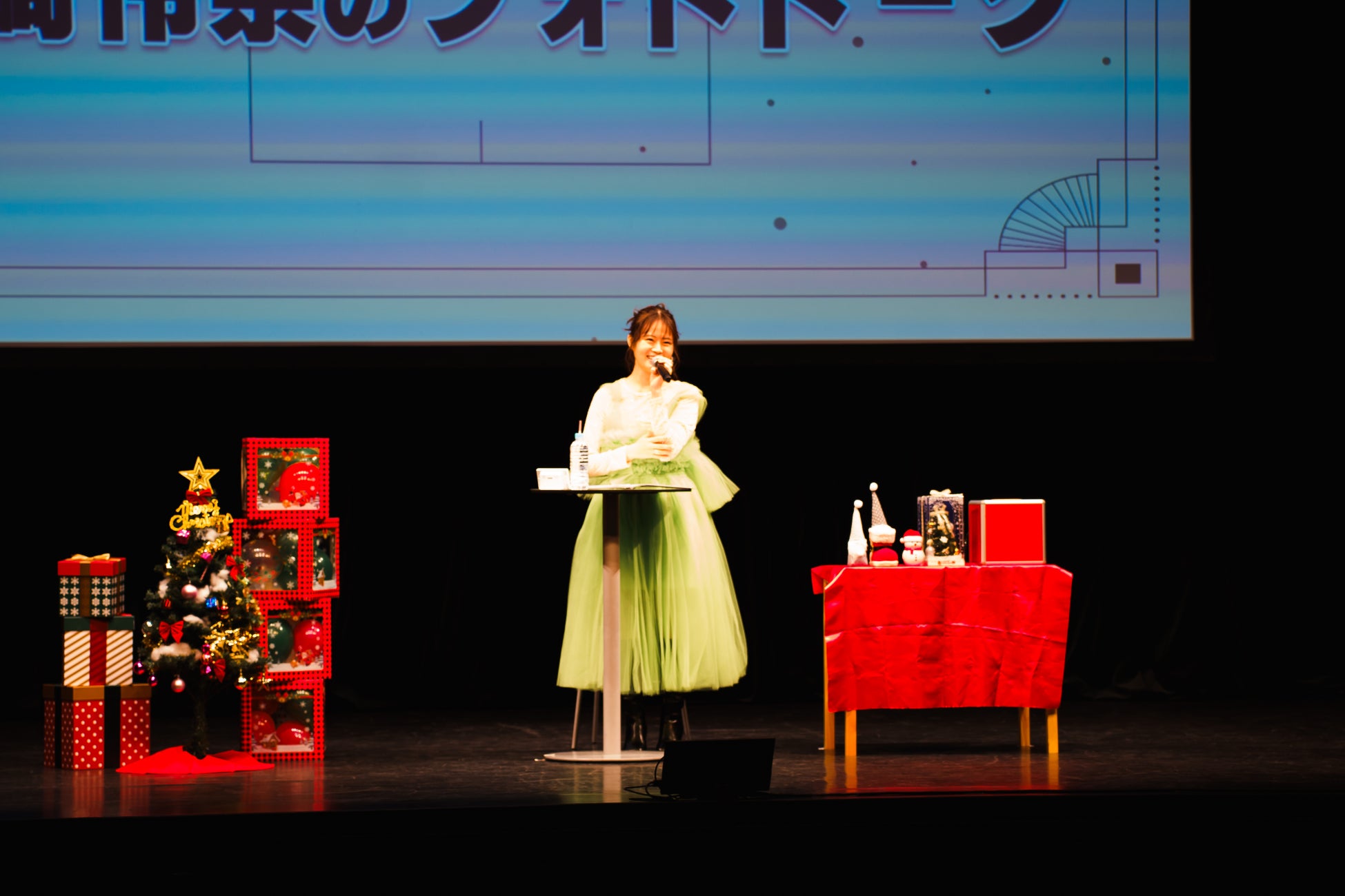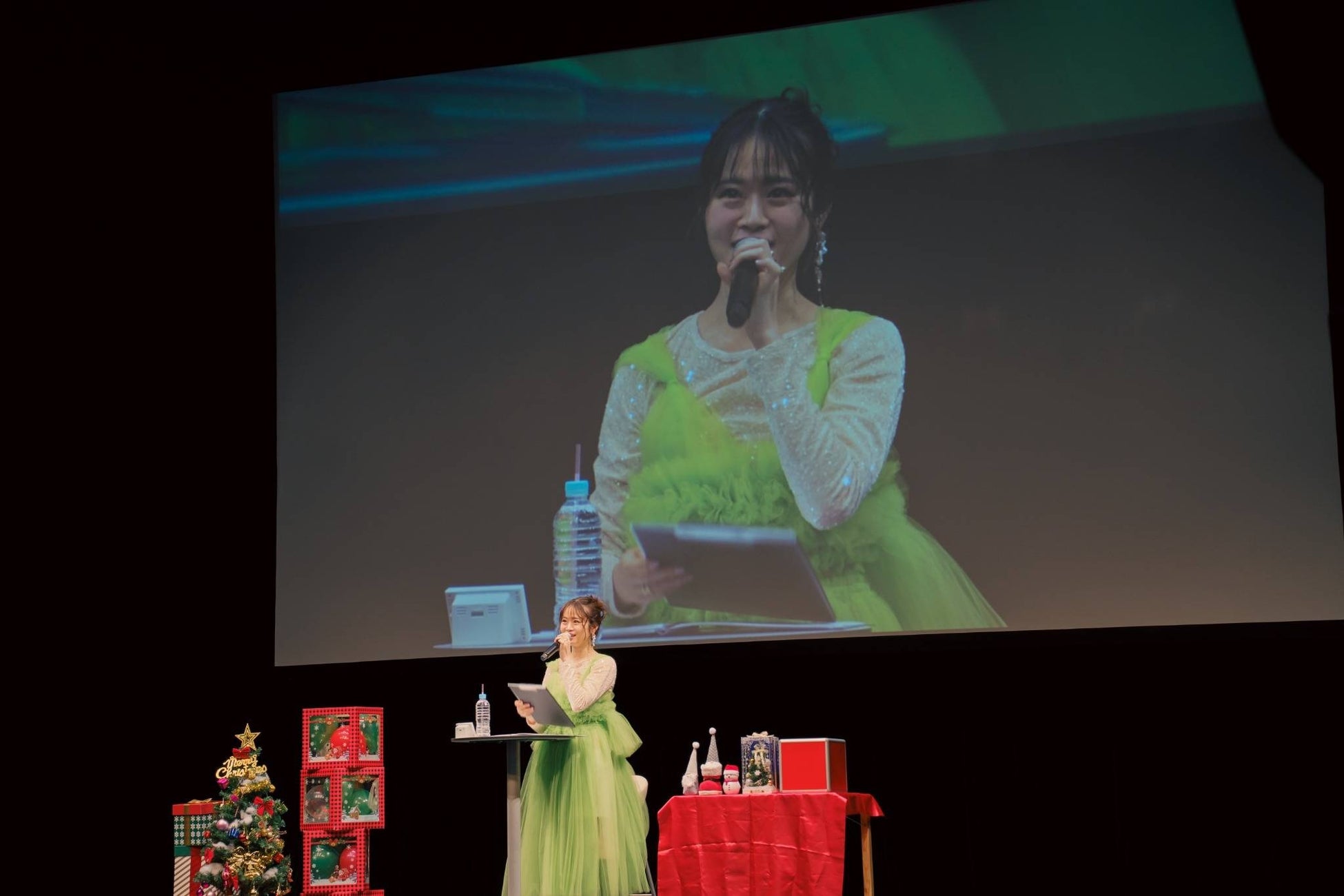 幕開けを飾ったのは、感謝祭恒例の人気企画【MEMORIES OF 2024!山崎怜奈のフォトトーク】。このコーナーでは、2024年の思い出を写真とともに振り返る内容が展開されました。今回のイベントでしか見られない、およそ100枚にも及ぶ貴重な写真がスクリーンに映し出され、仕事の裏話やプライベートのエピソードを披露しました。