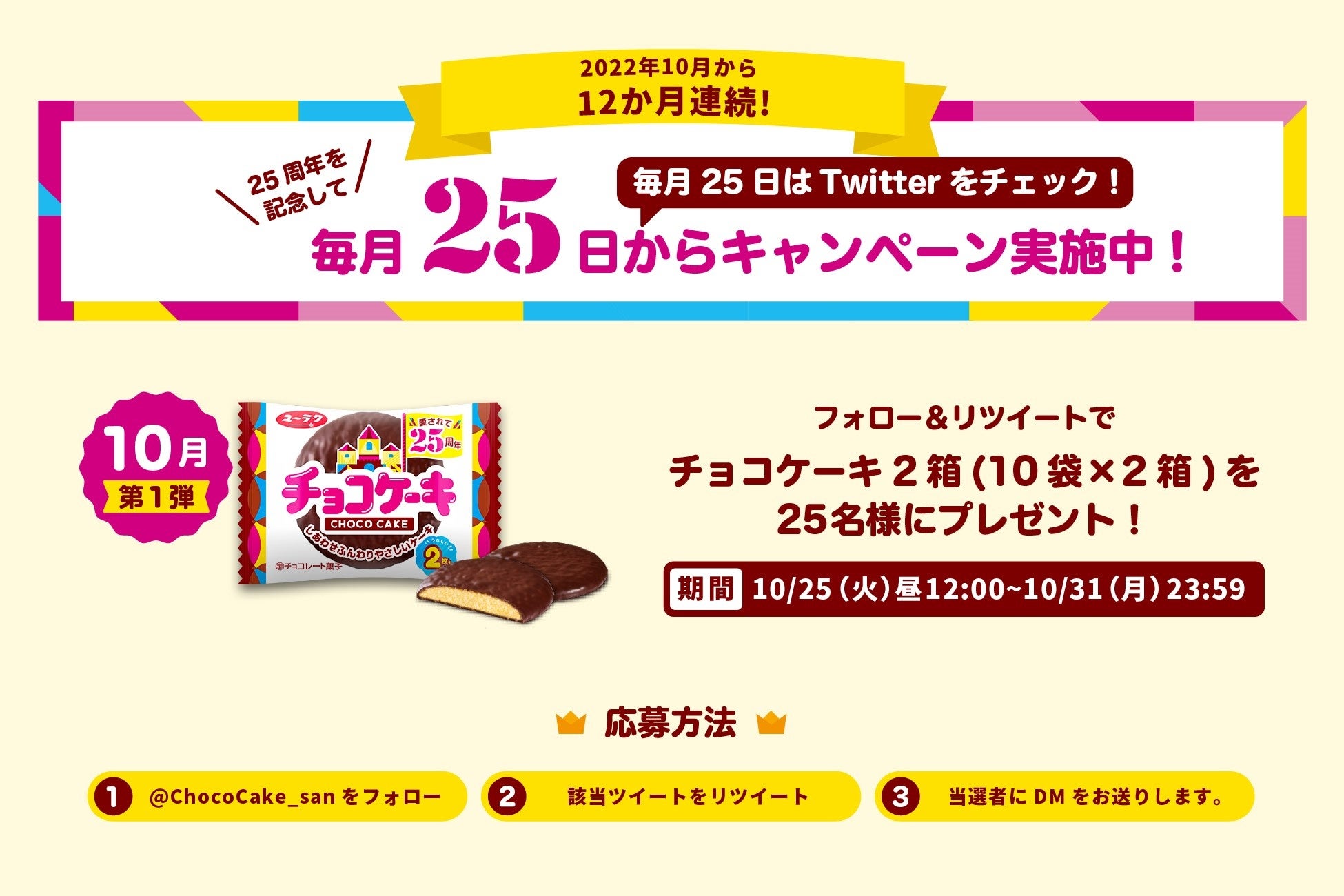 ユーラク「チョコケーキ」25周年を記念し、より多くのみなさまにチョコケーキのおいしさを知っていただけるよう、2022年10月より12か月連続でチョコケーキが当たるキャンペーンを実施します。25周年に掛けて、毎月25日からスタートするキャンペーンをどうぞお楽しみに♪