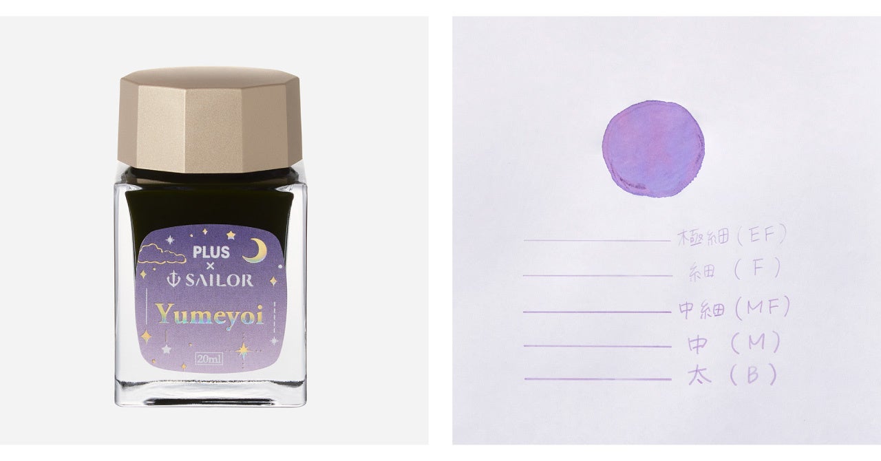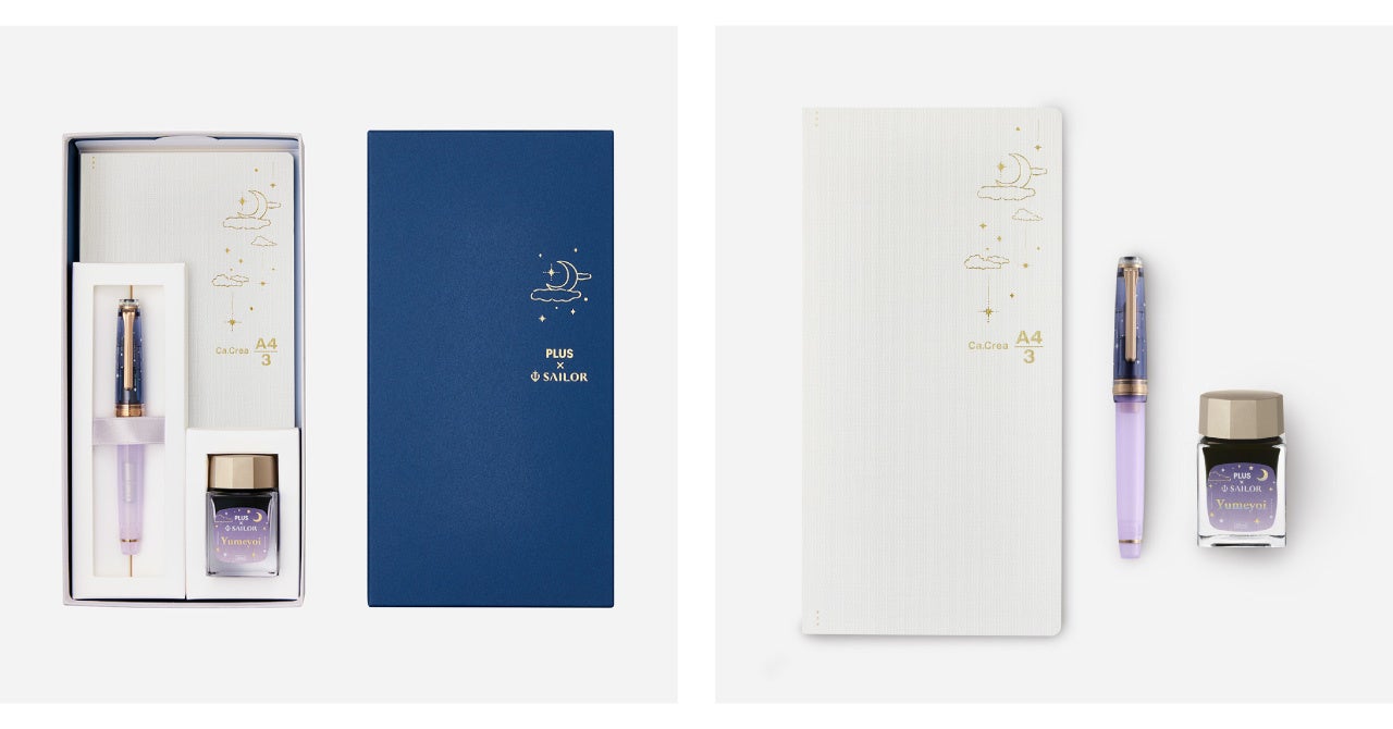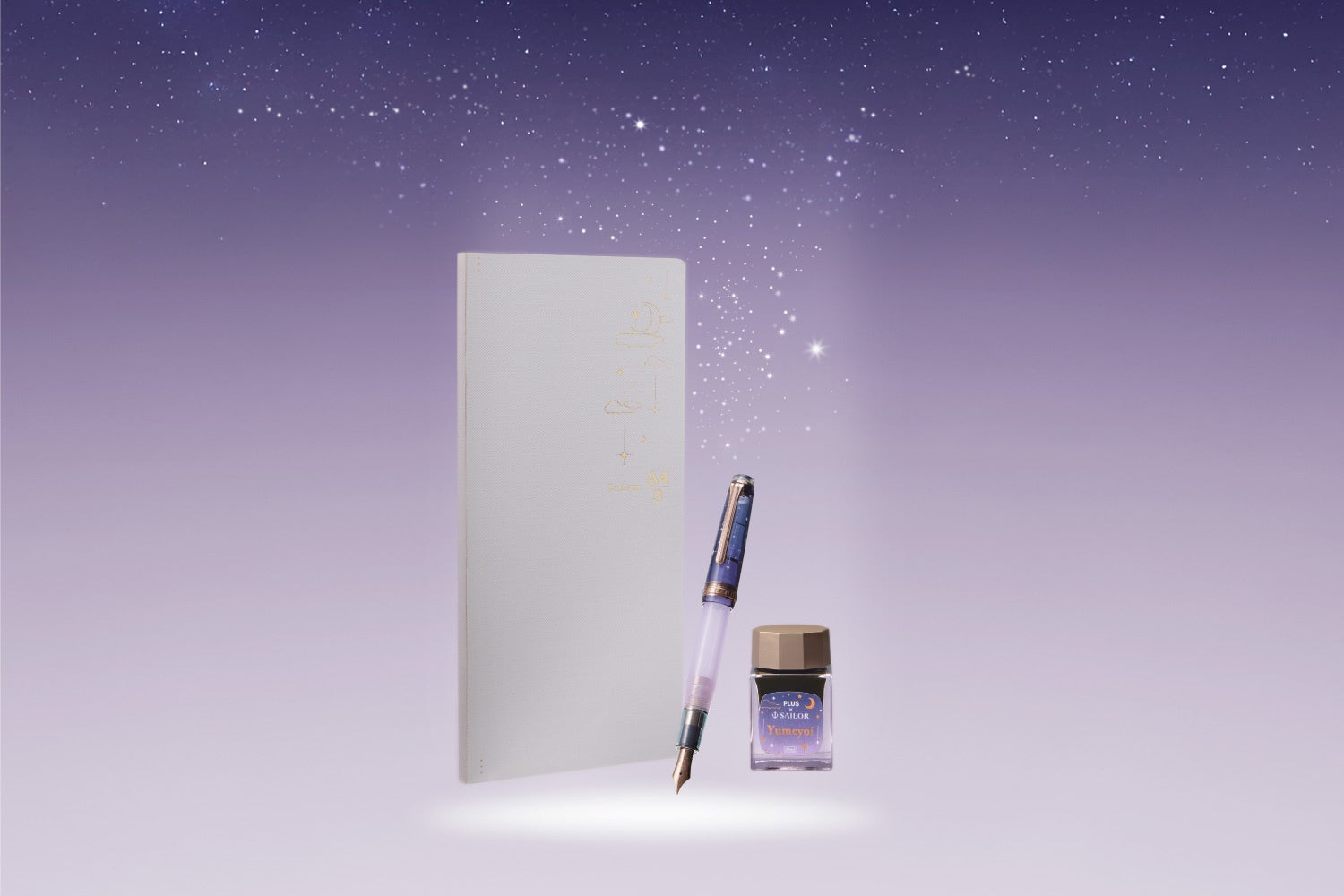 プラスとセーラー万年筆のコラボレーション企画第9弾となる本商品は、夢と現実の間を彷徨うような幻想的な世界観を「夢宵」と表現した、ノート、万年筆、ボトルインクの3点セットです。