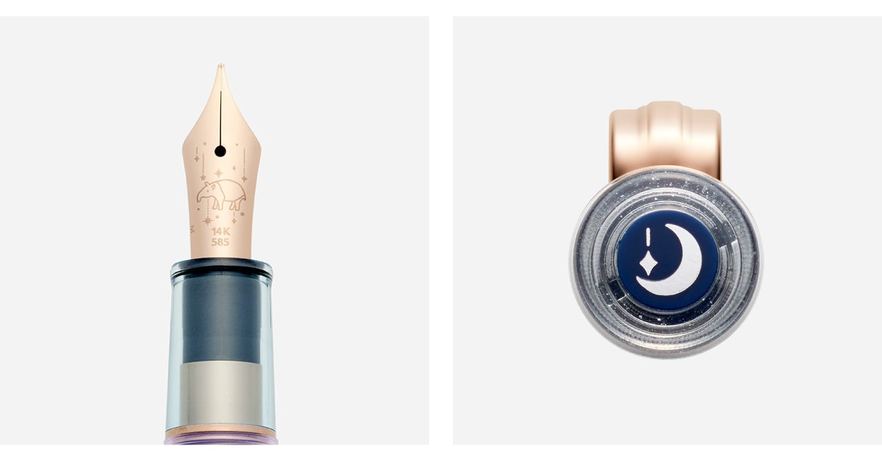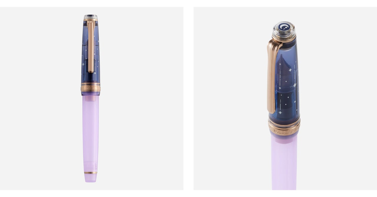 アンコーラ限定Ver.のプロフェッショナルギア スリムは、宵の夜空に映しだされた星の舞い降るデザインが光るクリアブルーの蓋と、淡いパープルの胴を組み合わせた1本。蓋栓飾りには月と星の箔押しが、アンティークゴールドIP仕上げのペン先には、伝説上のバクが刻まれています。字幅は極細字(EF)から太字(B)までの5種類をご用意しました。