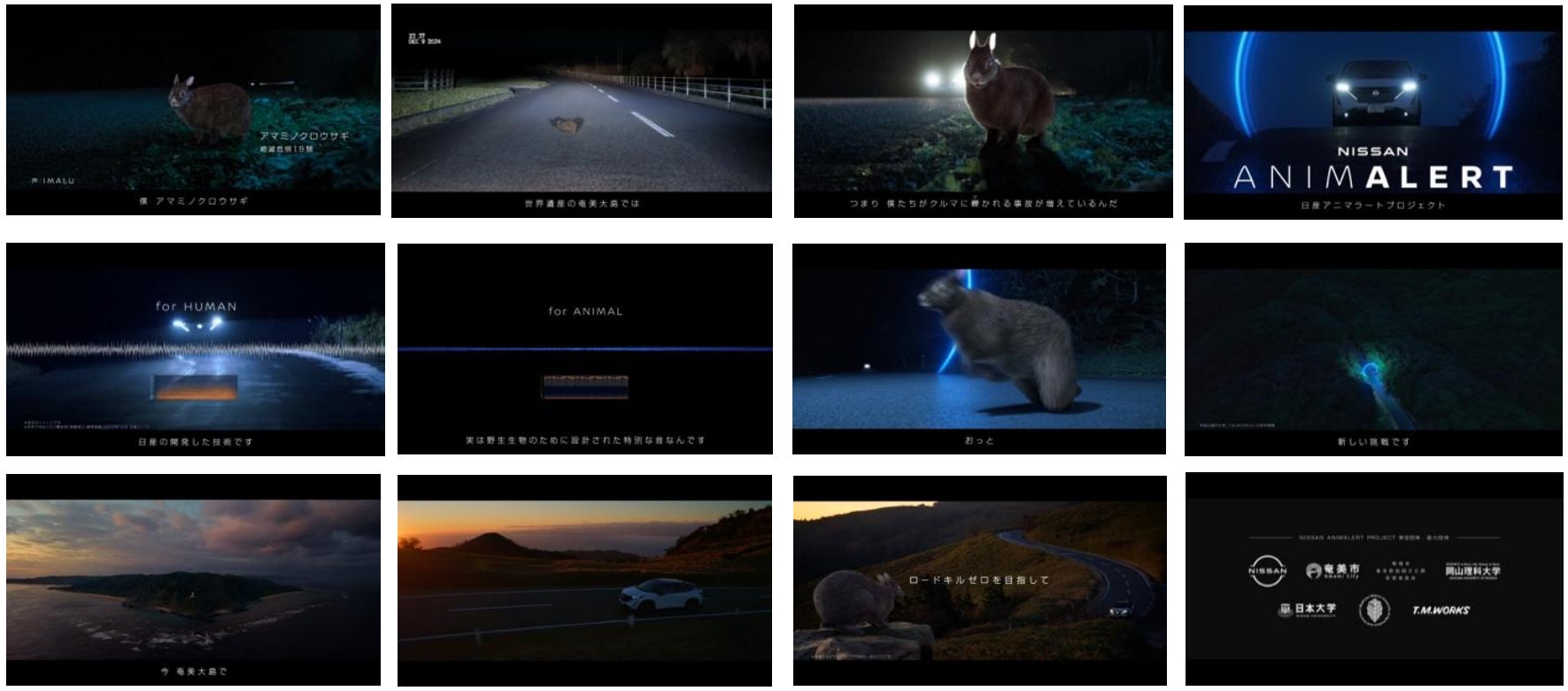アマミノクロウサギが視聴者にロードキルが増えていることを語りかけるシーンからスタートします。その後、日産自動車がこのプロジェクトを始めた意義や、技術を紹介しています。最後に今回のプロジェクトにかける意気込みを紹介しています。