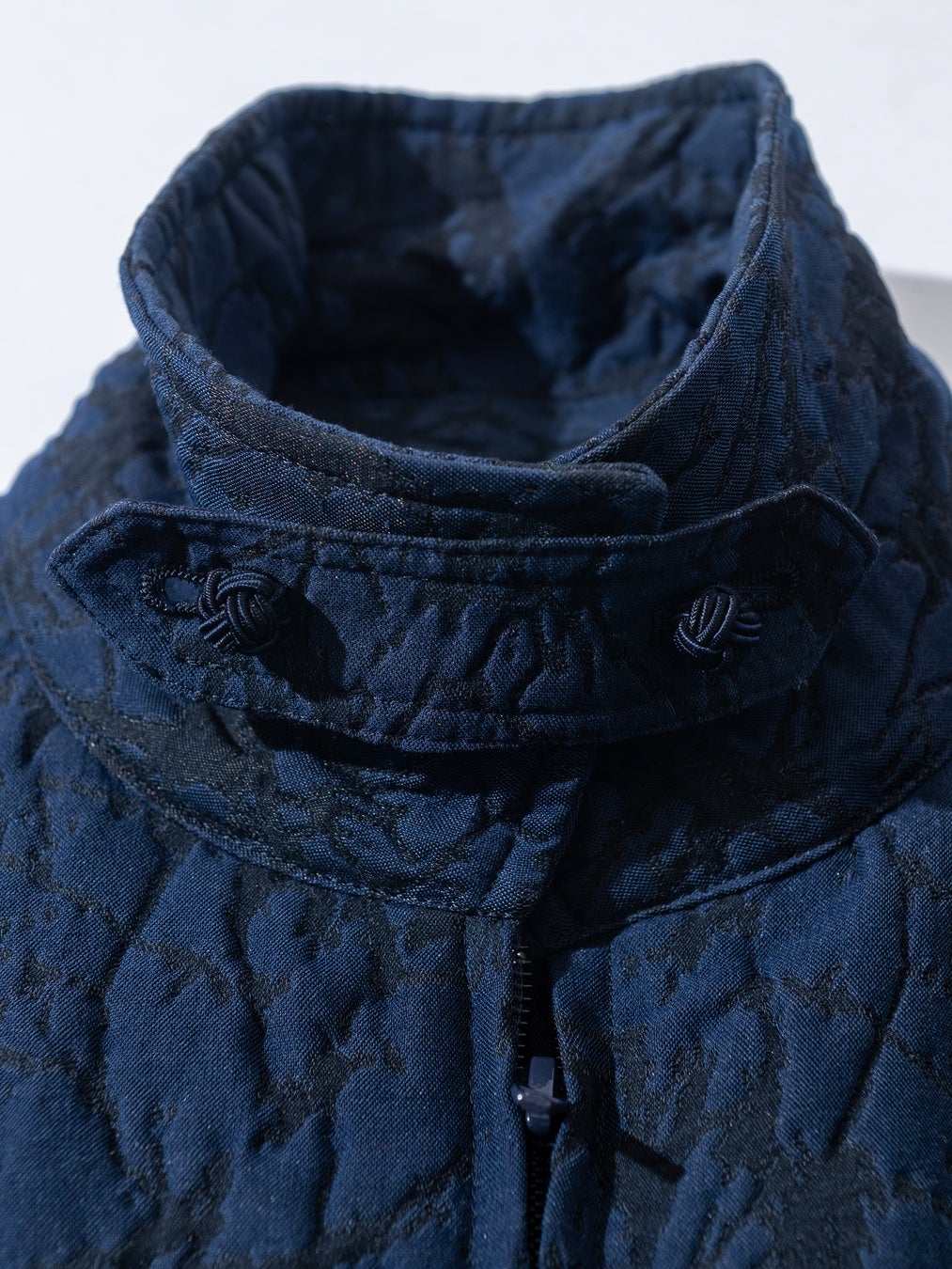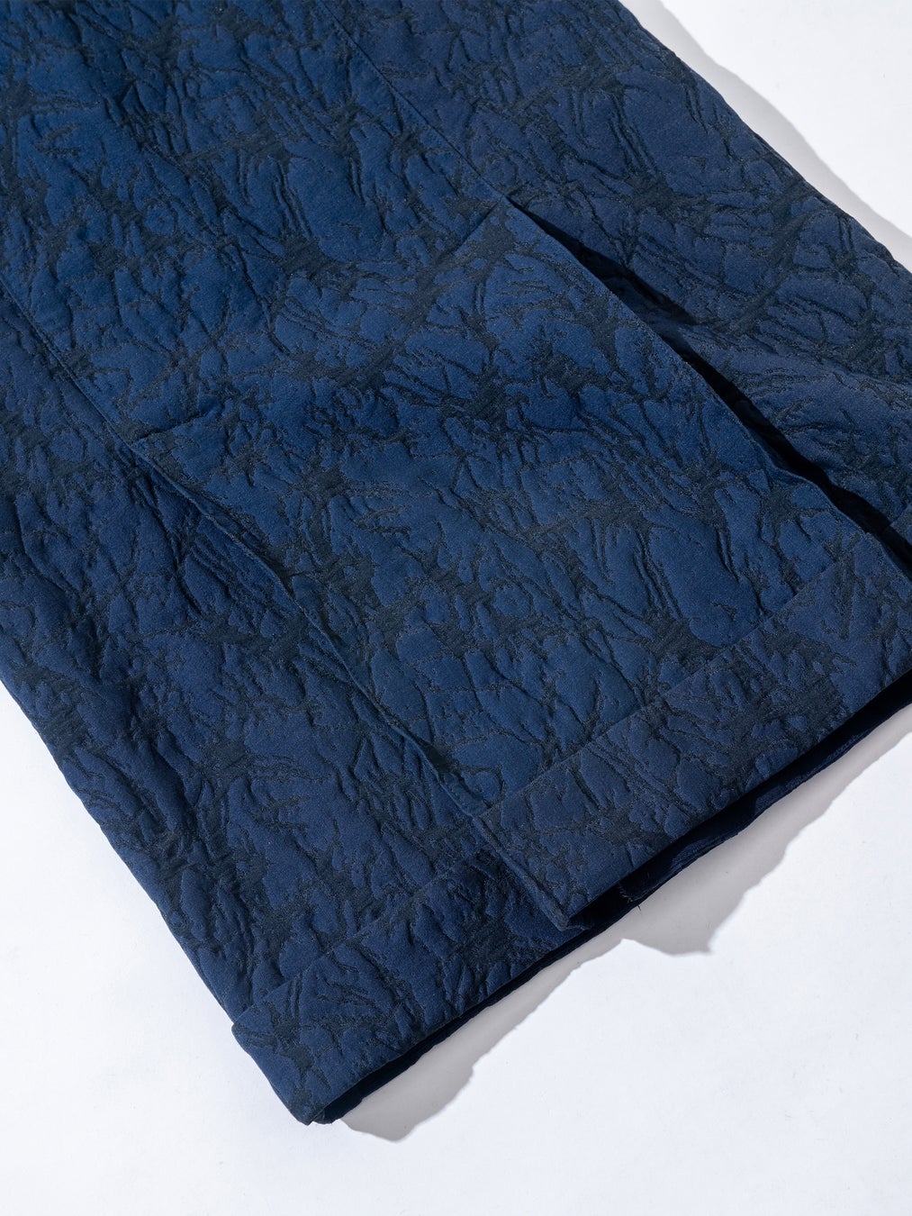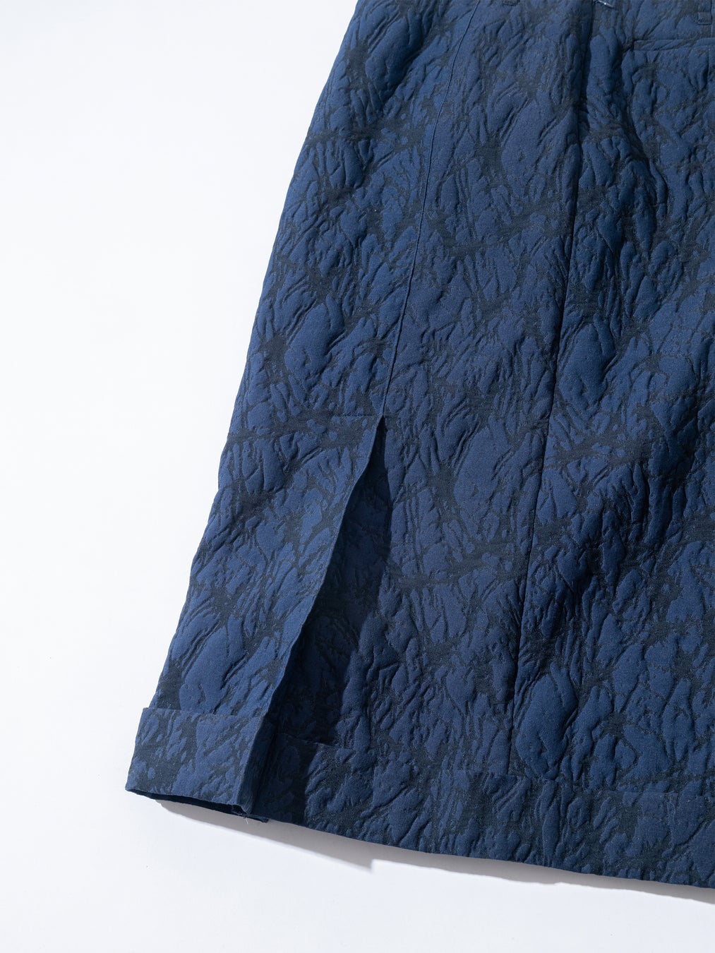 裾のスリットには「水引」を思わせるノットディテールをあしらい、さりげないアクセントを添えました。構築的でありながら過度に主張しない設計により、ガラスジャカード特有のクラシックな質感を引き立て、全体を品よくエレガントにまとめています。