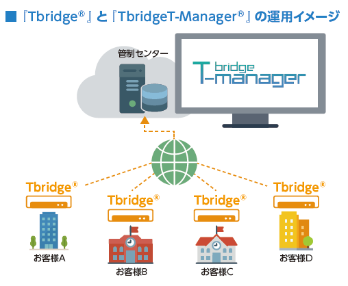 この『Tbridge®』が収集するリアルタイムのトラフィック分析や障害イベント、使用者現況などのネットワーク情報を蓄積・活用し、集中管理モニタリングできるシステムが『TbridgeT-Manager®』です。