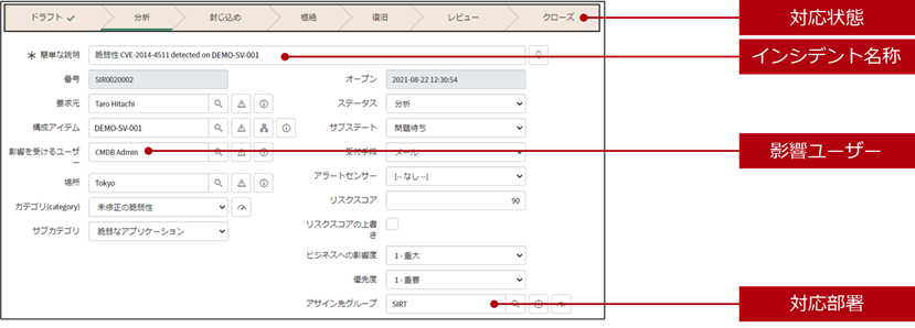脆弱性情報や製品情報はServiceNowのSecurity Operations上で一元管理されます。セキュリティ対策が必要な製品が検出された場合、自動的にインシデントを起票し、設計・開発・品質管理部門など関連部署に調査・対応の依頼を展開することができます。脆弱性に関わる基本情報に加え、リスクスコアがついた状態で依頼が通知されるため、担当部署では優先度に応じて効率的な調査・対策の業務を進めることができます。また、深刻な脆弱性が検出された際に対応が遅れた場合などは、催促メールの自動通知など対策を確実に進めるためのワークフローも提供されます。