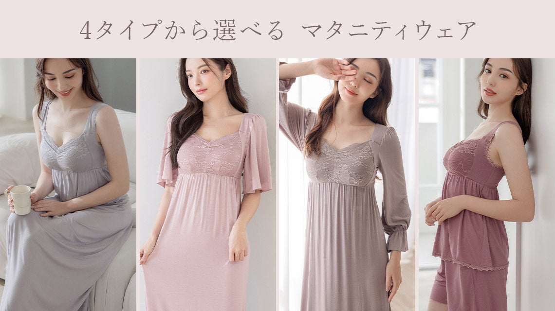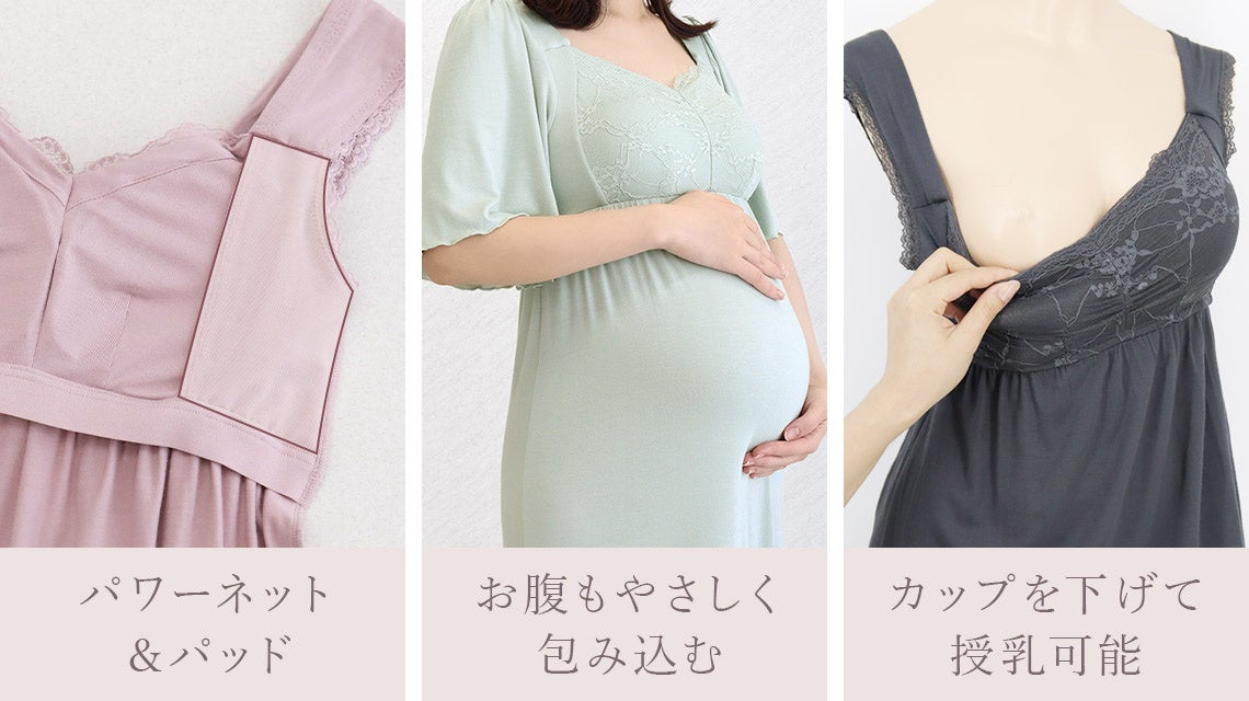 『ナイトブラ+マタニティウェア』として、授乳で張るバストや授乳後の気になる下垂れなどもやさしく包み込み、24時間バストケアしてご自愛を。