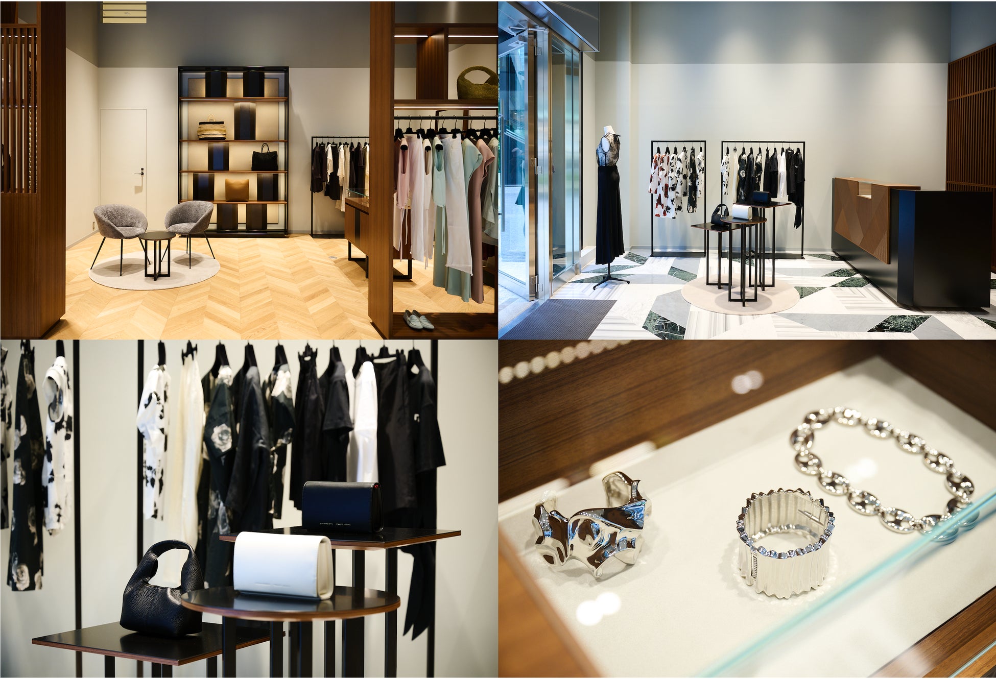 日本初となる「リヴィアナ コンティ」の店舗は、面積約65平方メートルのスペースに、ブランドの美学と上質な素材がエレガントに調和しています。アールデコに着想を得た店舗デザインは、温かみのあるヴェンゲと洗練された大理石のコントラストが特徴。「リヴィアナ コンティ」のコレクションにも多用される幾何学的なパターンと建築的なラインを反映しています。