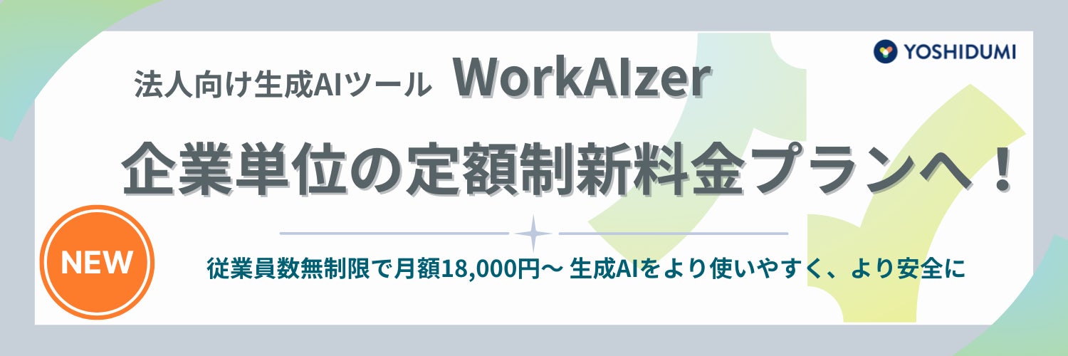吉積情報株式会社(本社:東京都千代田区、代表取締役社長:秋田晴通、以下「吉積情報」)は、法人向け生成AIツール「WorkAIzer(ワークアイザー)」において、企業単位のシンプルな定額新料金プランをリリースし、2025年4月21日より提供開始することを発表いたします。