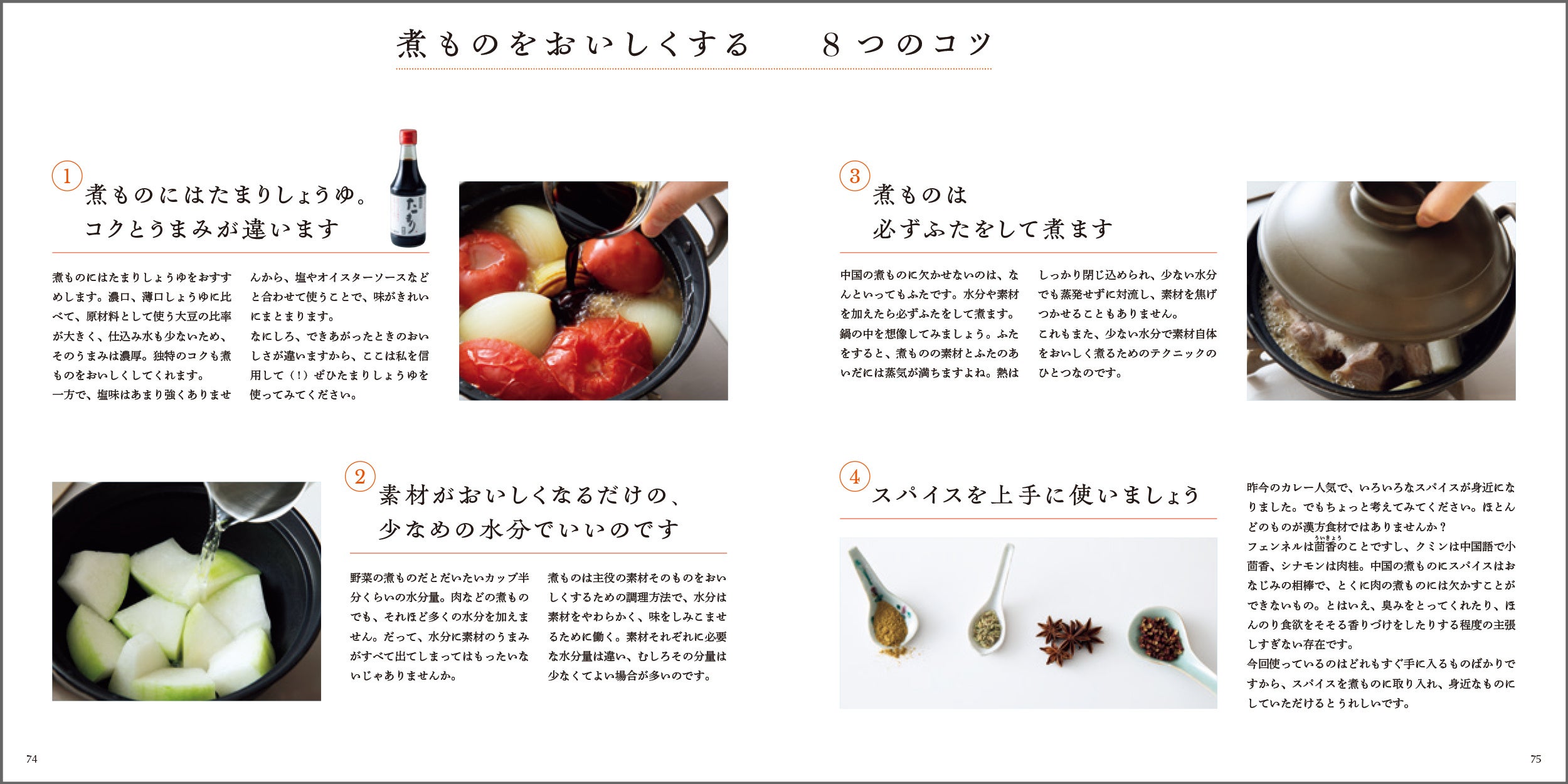 ●調味料や必要な水分量、ふたをして煮る、時間差で煮る…などの煮ものをおいしくするコツは、本書でしっかり掲載。