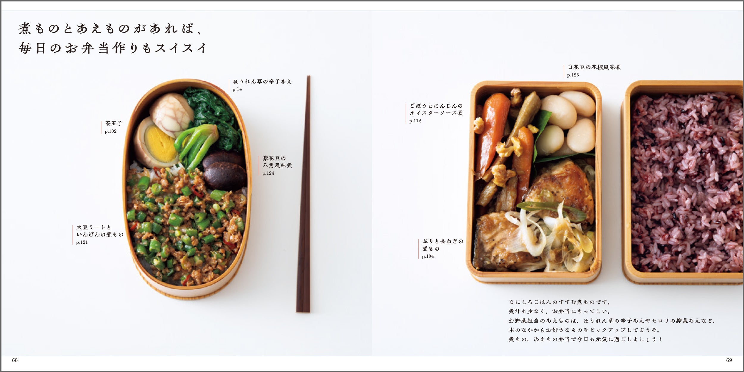 誰もが忙しい時代だからこそ、作る時間を合理的に短縮でき、栄養バランスのよい食事は重宝します。本書では、野菜たっぷりの「あえもの」に、肉や魚などのたんぱく質が摂れる「煮もの」のレシピ約100点を紹介。2つを組み合わせれば、手際よく2品が完成! そのうえ、炭水化物、たんぱく質、脂質などの食生活のバランスが無理なく整います。