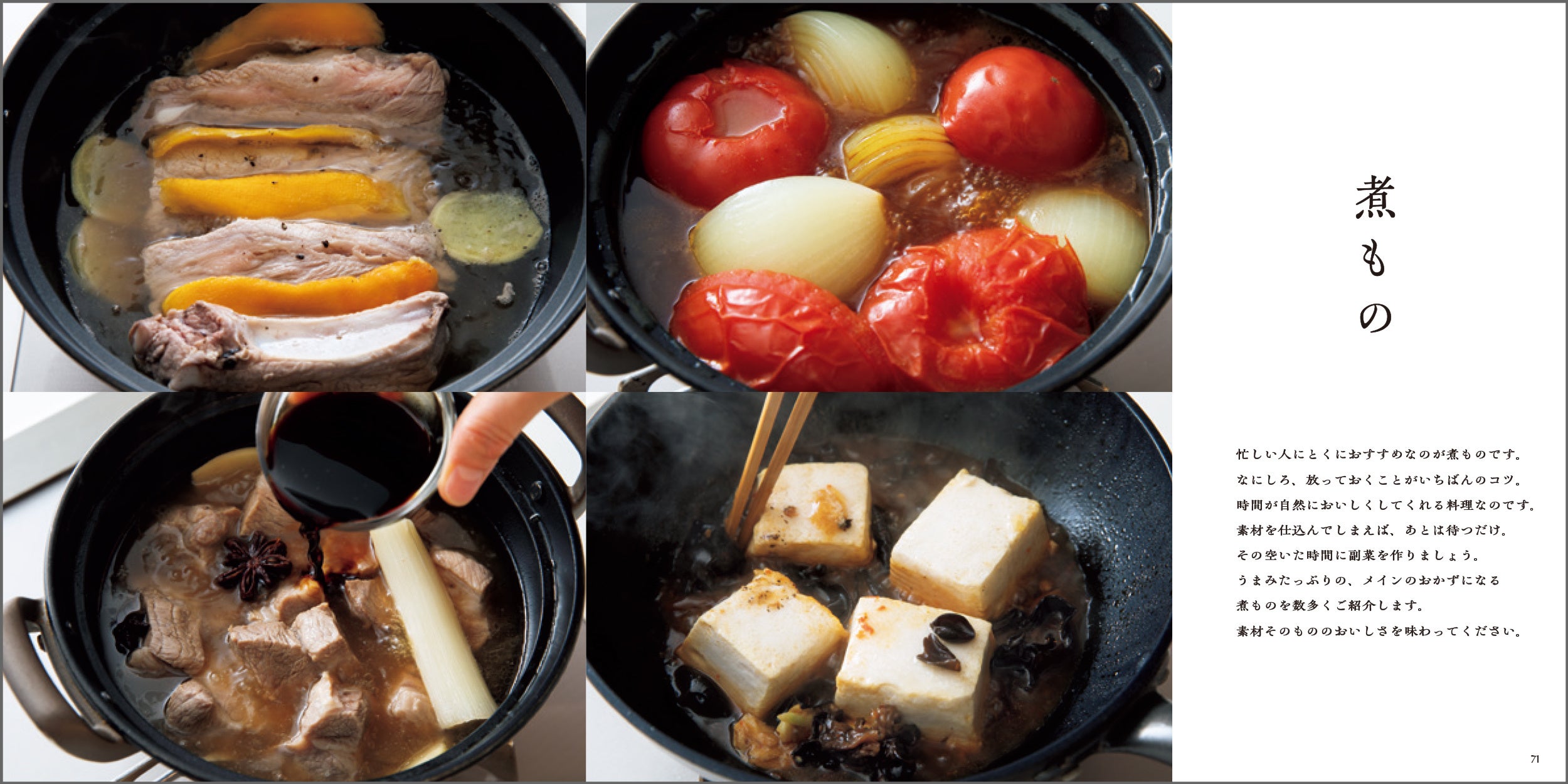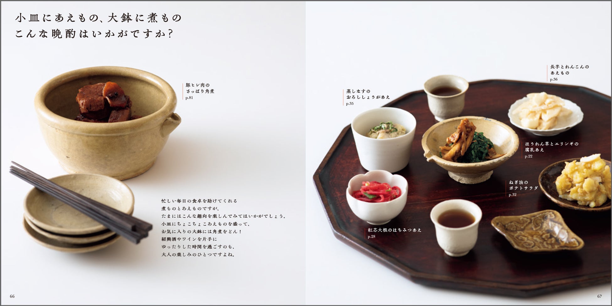 「なにしろ煮ものは仕込んでさえしまえば、手も時間も空きます。火が素材をおいしくしてくれているこの間に、あえものをささっと作る。合理的で、しかもおいしいものが食べられるのですから、最高の組み合わせです。」(本文「はじめに」より抜粋)。