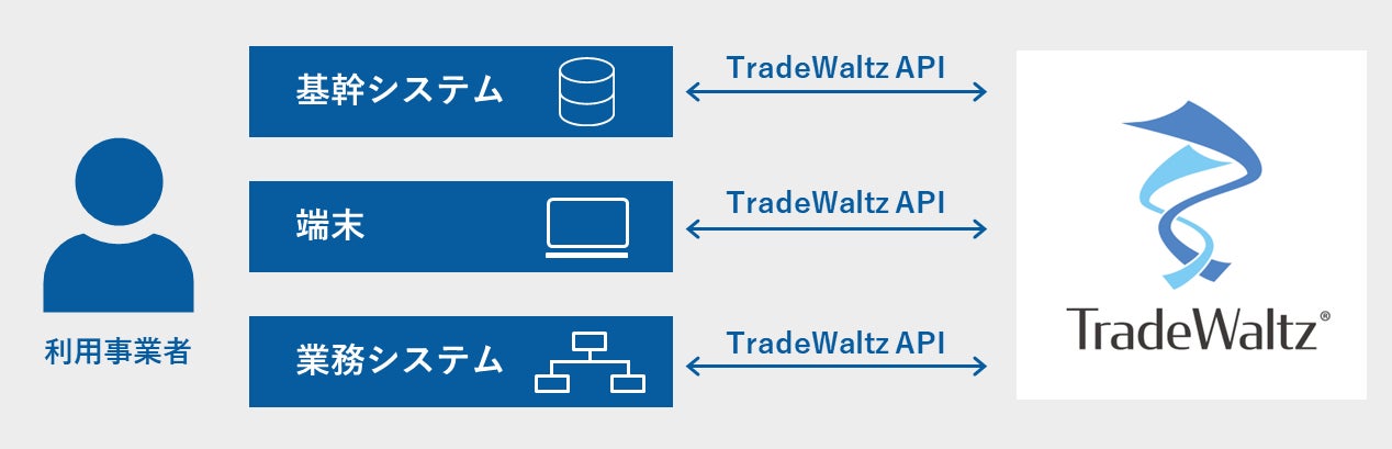 TradeWaltzはAPI仕様を一般公開しております。特に大企業の貿易実務者には、既にご利用されている基幹システムや業務システムから経由してAPI接続をしていただき、認証を通じた高セキュリティ下で、TradeWaltzの契約情報・物流情報登録や、登録情報の閲覧、コミュニケーション支援などを行うことで、現行業務とTW業務の間をシームレスにつなぐ運用をオススメしています。